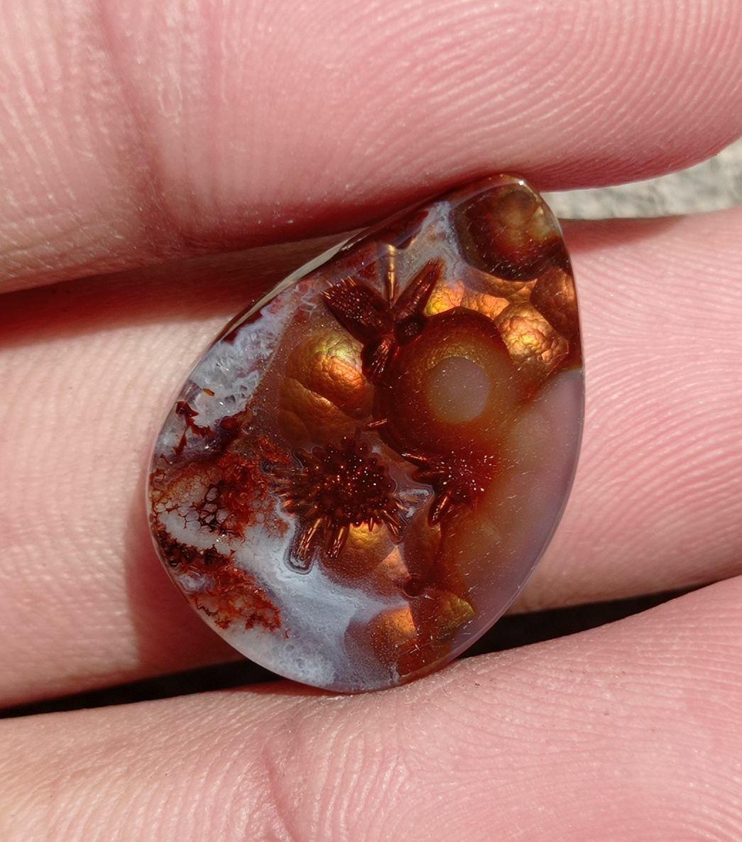 This 16.9ct Unique Flowery Fire Agate is a rare gemstone and an ideal gift. Its 23x16 mm pear shape is sure to impress. This gemstone is even rarer than diamonds and can be treasured for many years to come.