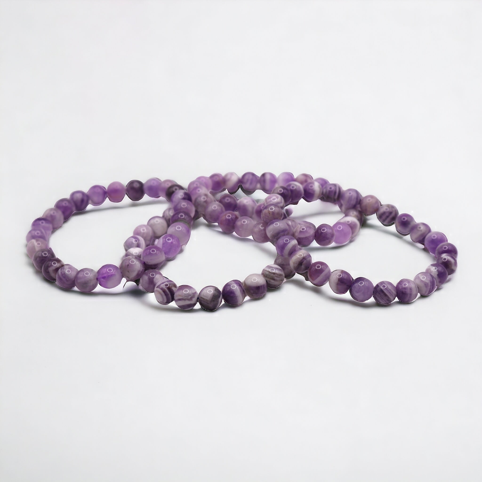 This elegant bracelet features high-quality 8mm Chevron Amethyst beads, known for their unique blend of white quartz and purple amethyst in a distinctive V-striped pattern. Chevron Amethyst is renowned for its powerful healing properties, combining the energies of amethyst and quartz to enhance spiritual growth, intuition, and inner peace. The uniform 8mm beads create a sleek and sophisticated design, perfect for those seeking both aesthetic beauty and spiritual benefits.