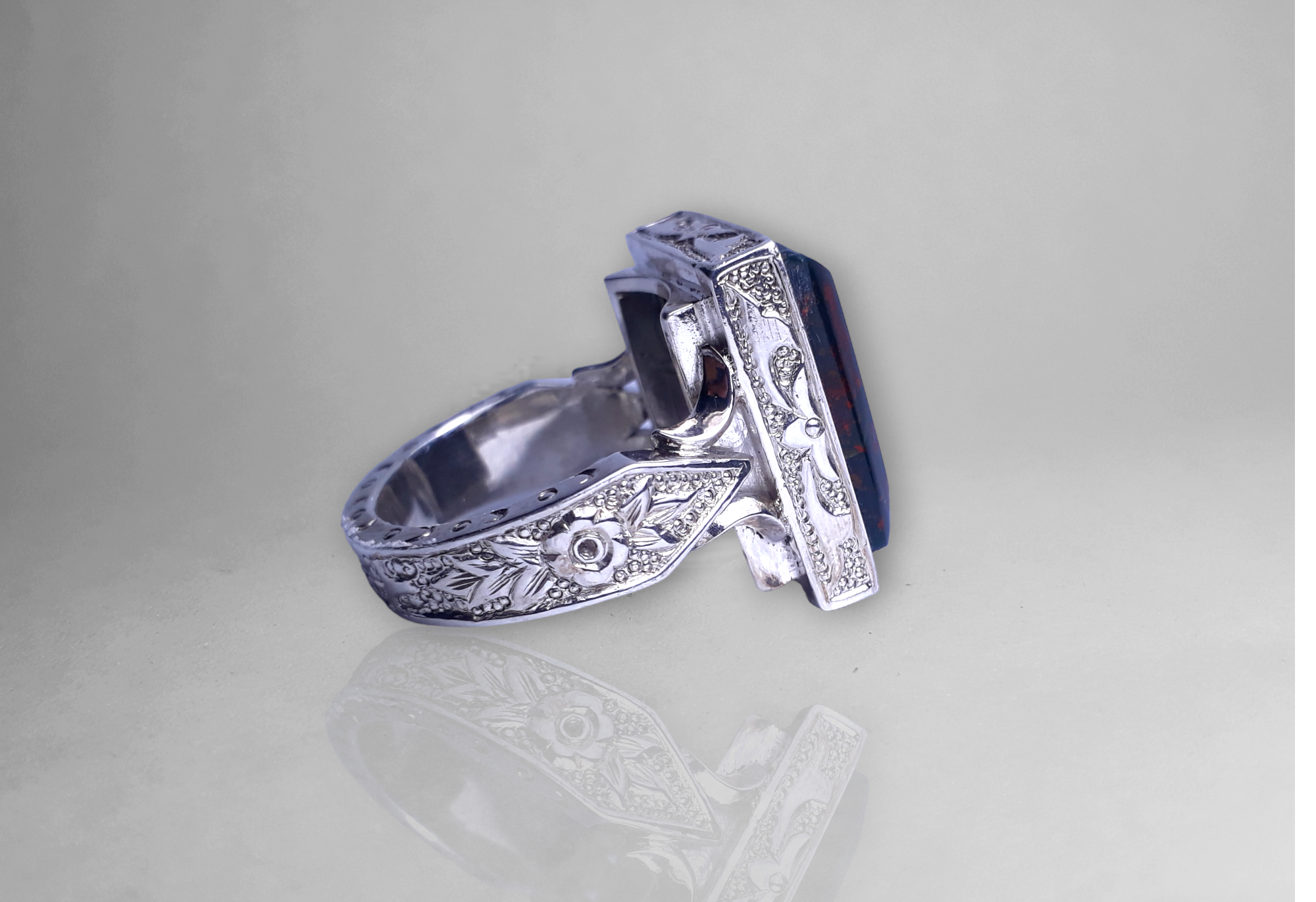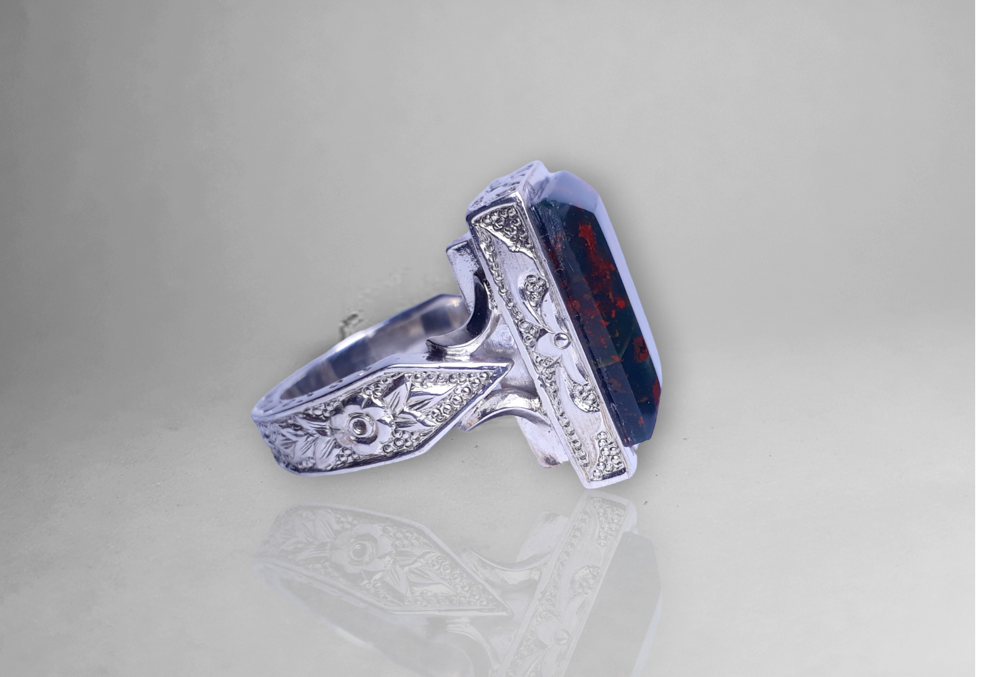 A Handcrafted Heliotrope Ring, also known as Blood Stone, precision-engraved in sterling silver - a true piece of art!
