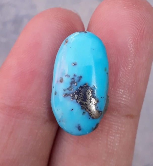 This classic Persian Turquoise cabochon features a stunning deep blue color and intricate Pyrite matrix. Professionally-cut to shape, this 7.9-carat stone is a perfect choice for creating beautiful jewelry or using as a collectible. With its eye-catching design, it is sure to add beauty to any piece.