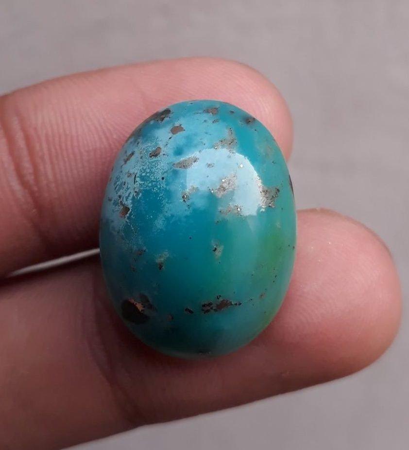 This Natural Turquoise with Pyrite gemstone features a dazzling blue/green color and is weighed at 23 carats. Its unique Shajri Feroza shape measures 22x17 mm, perfect for jewelry making. Enjoy the beauty of this hand-selected piece.