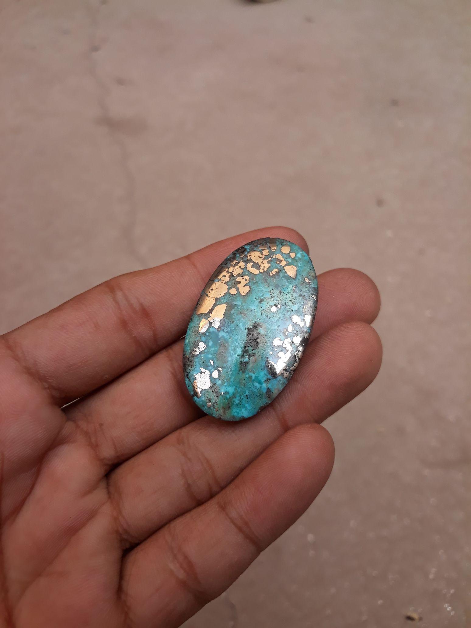 This Persian Turquoise has been carefully worked by a master lapidary, weighing in at 101 carats and boasting a 43x15mm oval shape. Its vibrant blue color is further accented by pyrite, giving it a multi-colored luster and making it the perfect addition to any collection.