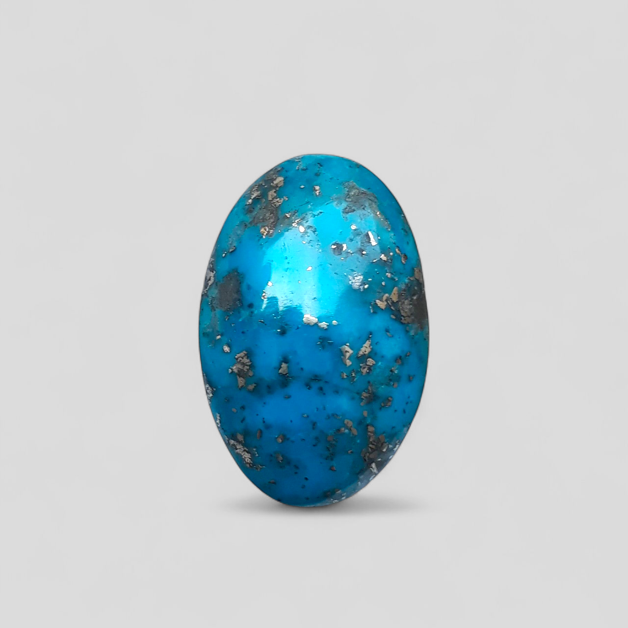 This classic Persian Turquoise cabochon features a stunning deep blue color and intricate Pyrite matrix. Professionally-cut to shape, this 30-carat stone is a perfect choice for creating beautiful jewelry or using as a collectible. With its eye-catching design, it is sure to add beauty to any piece..
