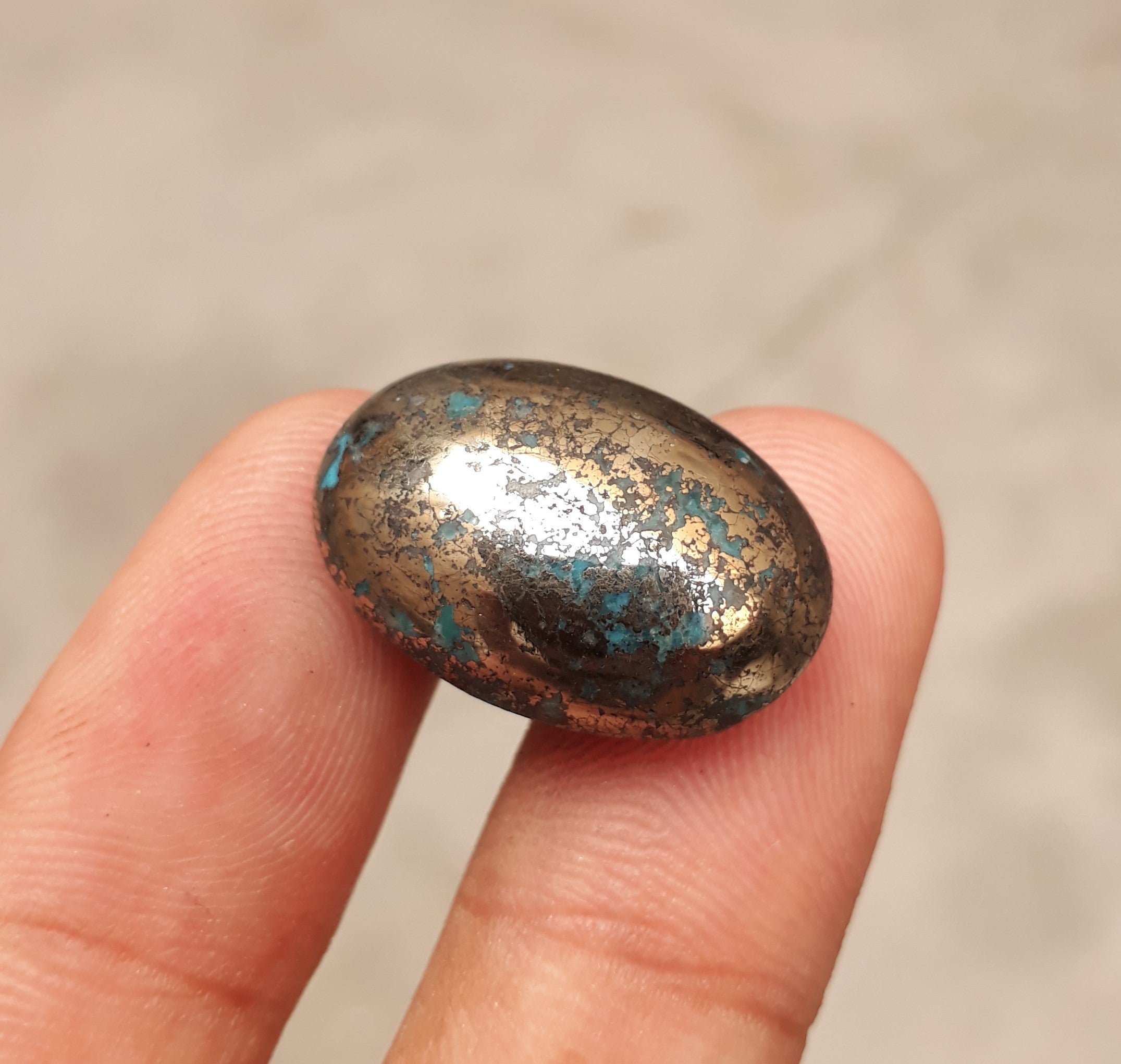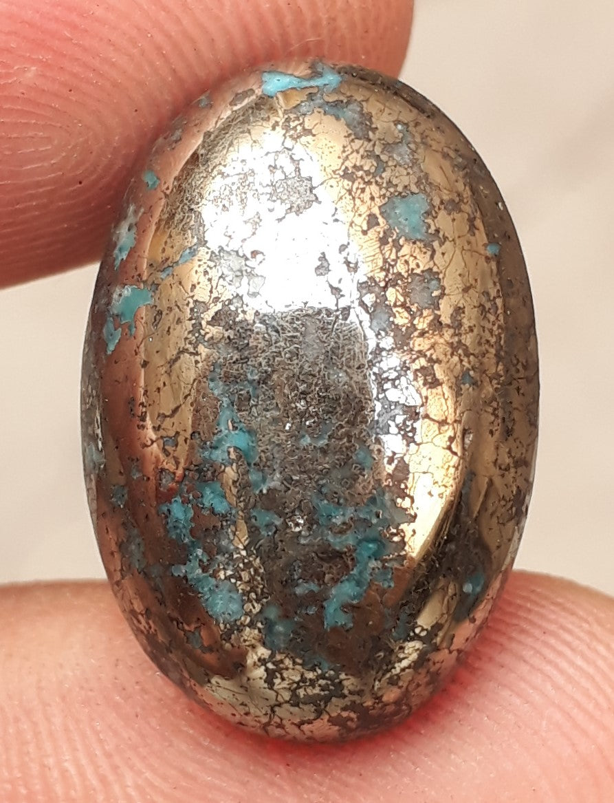This classic Persian Turquoise cabochon features a stunning deep blue color and intricate Pyrite matrix. Professionally-cut to shape, this 32-carat stone is a perfect choice for creating beautiful jewelry or using as a collectible. With its eye-catching design, it is sure to add beauty to any piece..