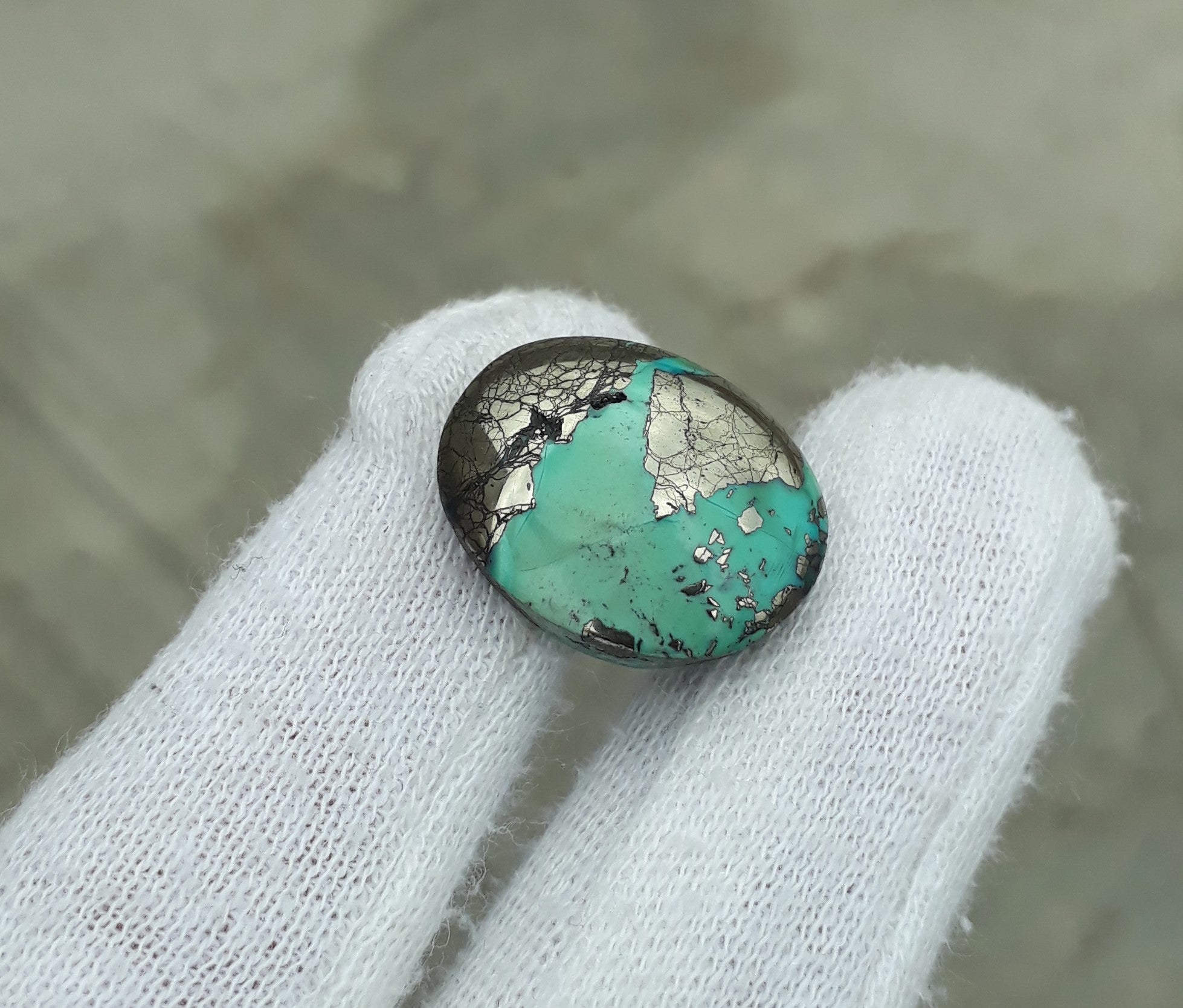 This classic Persian Turquoise cabochon features a green color and intricate Pyrite matrix. Professionally-cut to shape, this 35-carat stone is a perfect choice for creating beautiful jewelry or using as a collectible. With its eye-catching design, it is sure to add beauty to any piece..