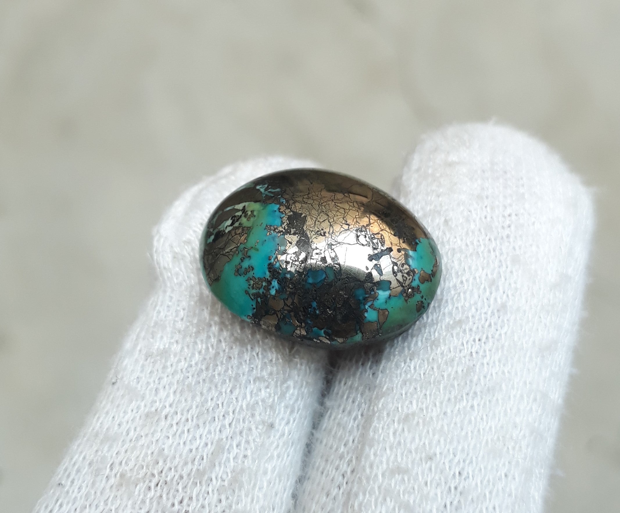 This classic Persian Turquoise cabochon features a stunning deep blue color and intricate Pyrite matrix. Professionally-cut to shape, this 35-carat stone is a perfect choice for creating beautiful jewelry or using as a collectible. With its eye-catching design, it is sure to add beauty to any piece..