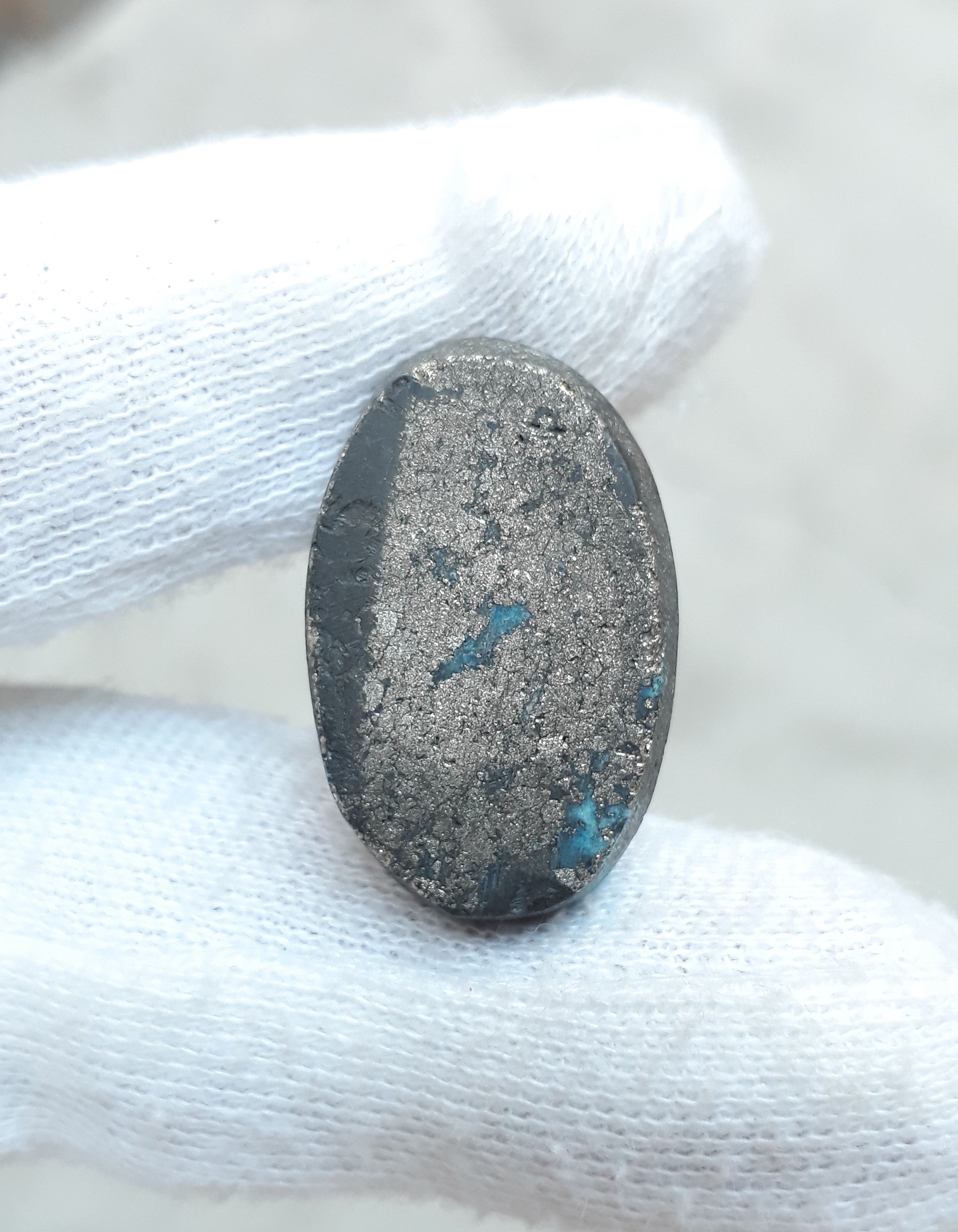 This classic Persian Turquoise cabochon features a stunning deep blue color and intricate Pyrite matrix. Professionally-cut to shape, this 60-carat stone is a perfect choice for creating beautiful jewelry or using as a collectible. With its eye-catching design, it is sure to add beauty to any piece..
