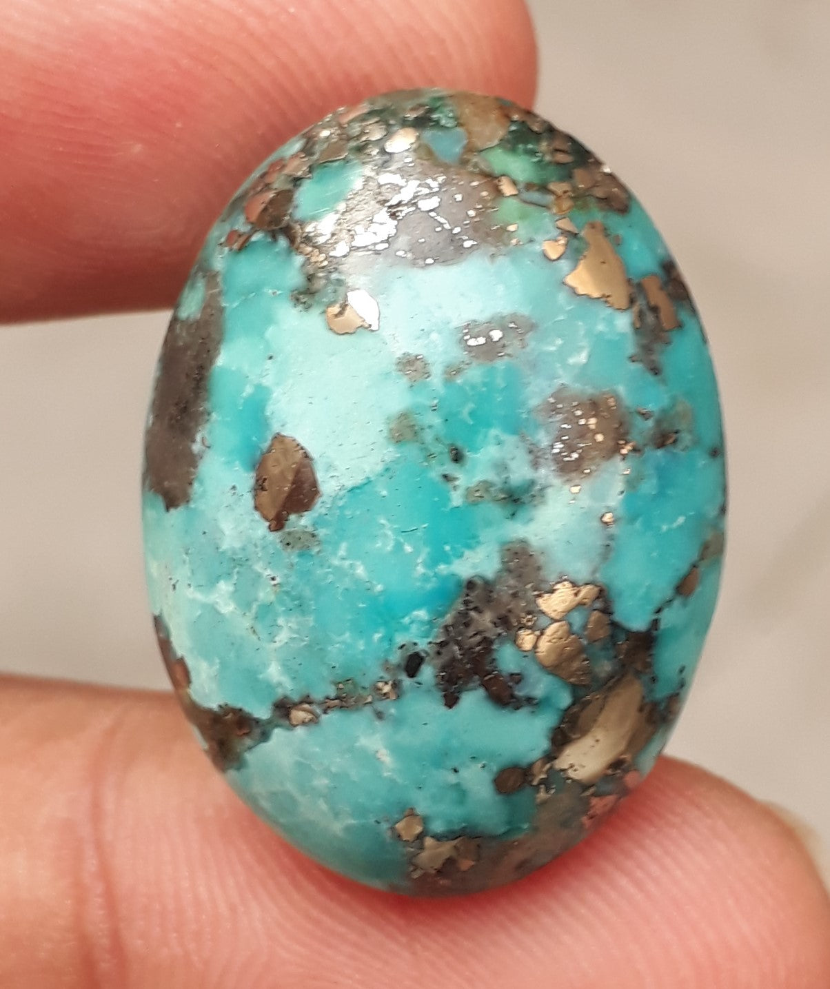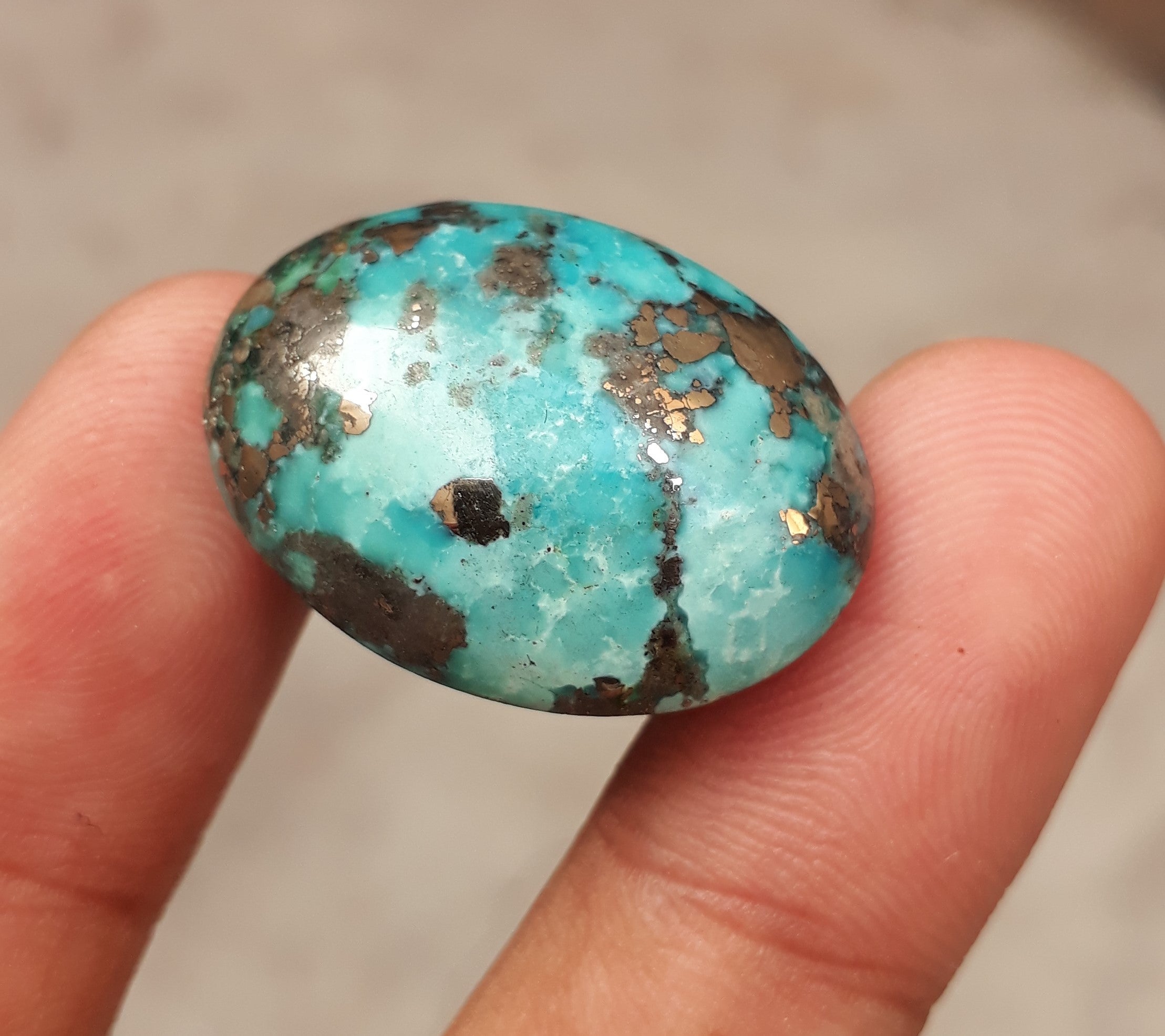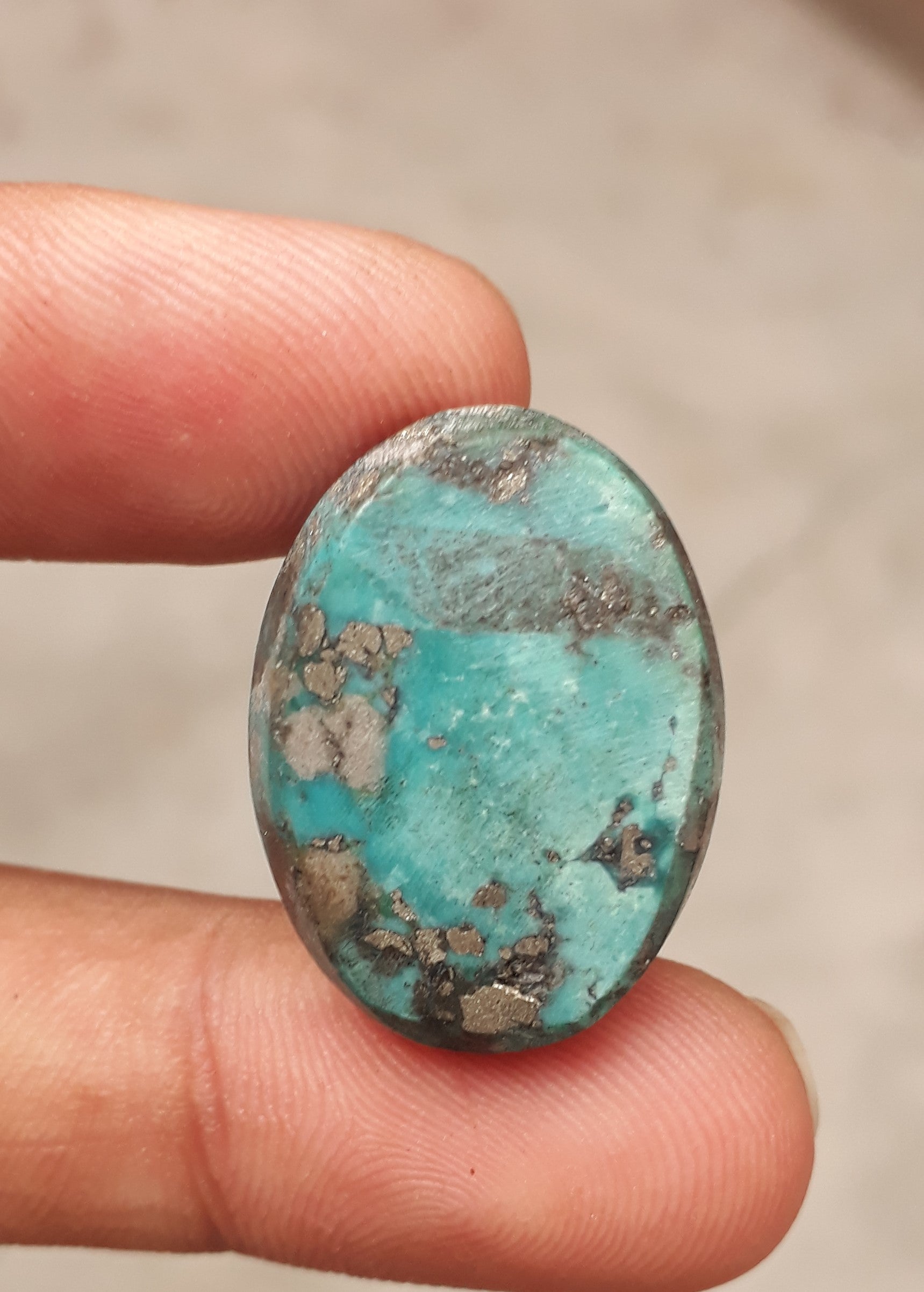 This classic Persian Turquoise cabochon features a stunning deep blue color and intricate Pyrite matrix. Professionally-cut to shape, this 42.50-carat stone is a perfect choice for creating beautiful jewelry or using as a collectible. With its eye-catching design, it is sure to add beauty to any piece..