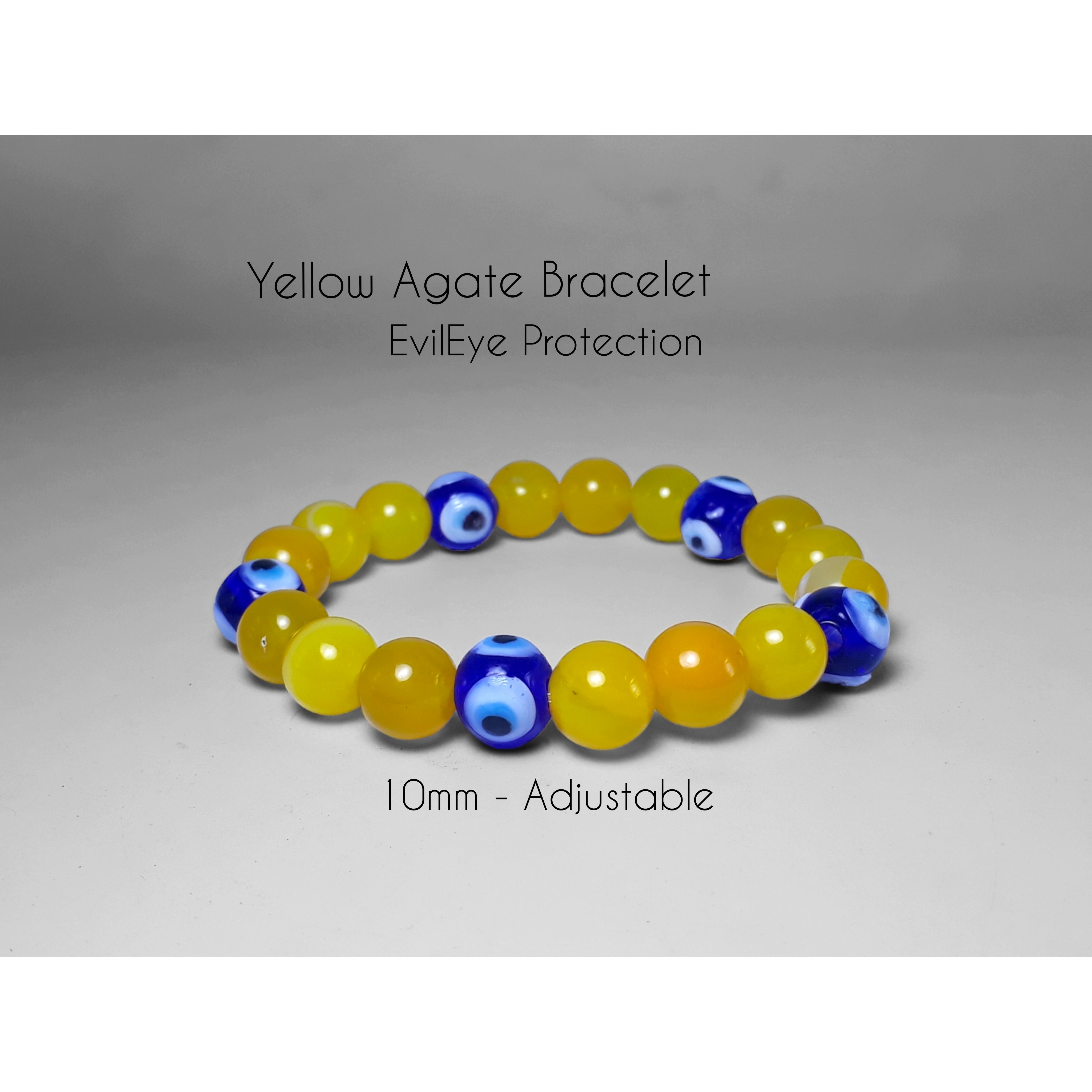 Этот стильный и значимый аксессуар сочетает в себе поднимающие настроение и балансирующие свойства натурального желтого агата с защитными свойствами бусины «Сглаз». Бусины из желтого агата способствуют уверенности, силе воли и позитиву, а бусина «Сглаз» защищает от негативной энергии и несчастий.