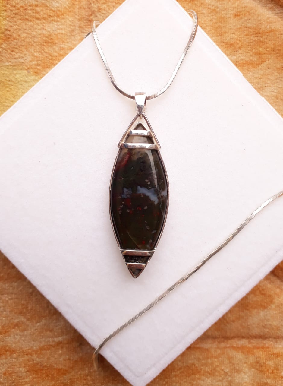 Этот кулон изготовлен из зеленого индонезийского шаджри акика (мохового агата), который известен своими целебными свойствами, включая укрепление иммунной системы, снижение стресса и беспокойства, а также помощь в эмоциональном исцелении. Он выполнен в итальянском серебре, что придает ему классический и стильный вид.