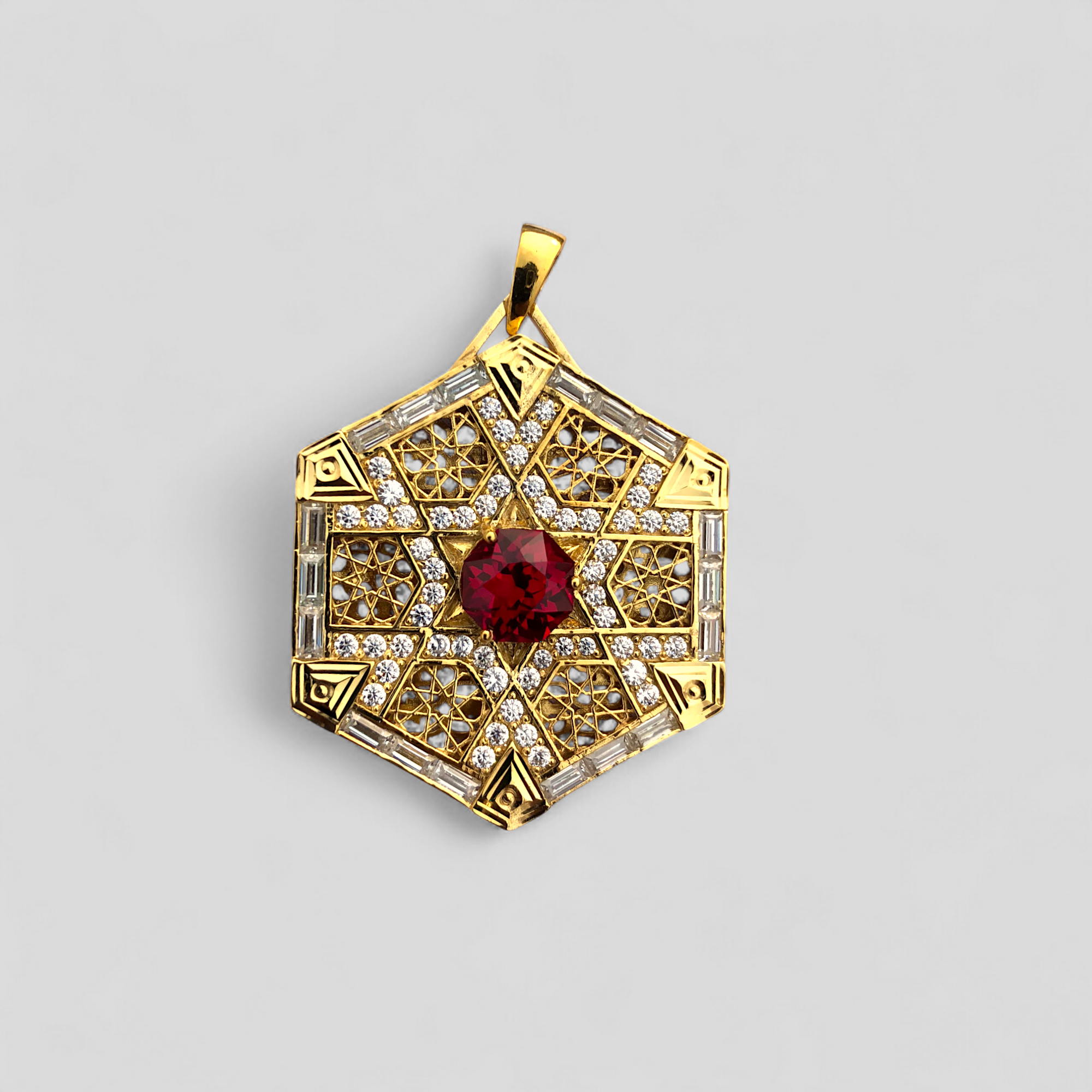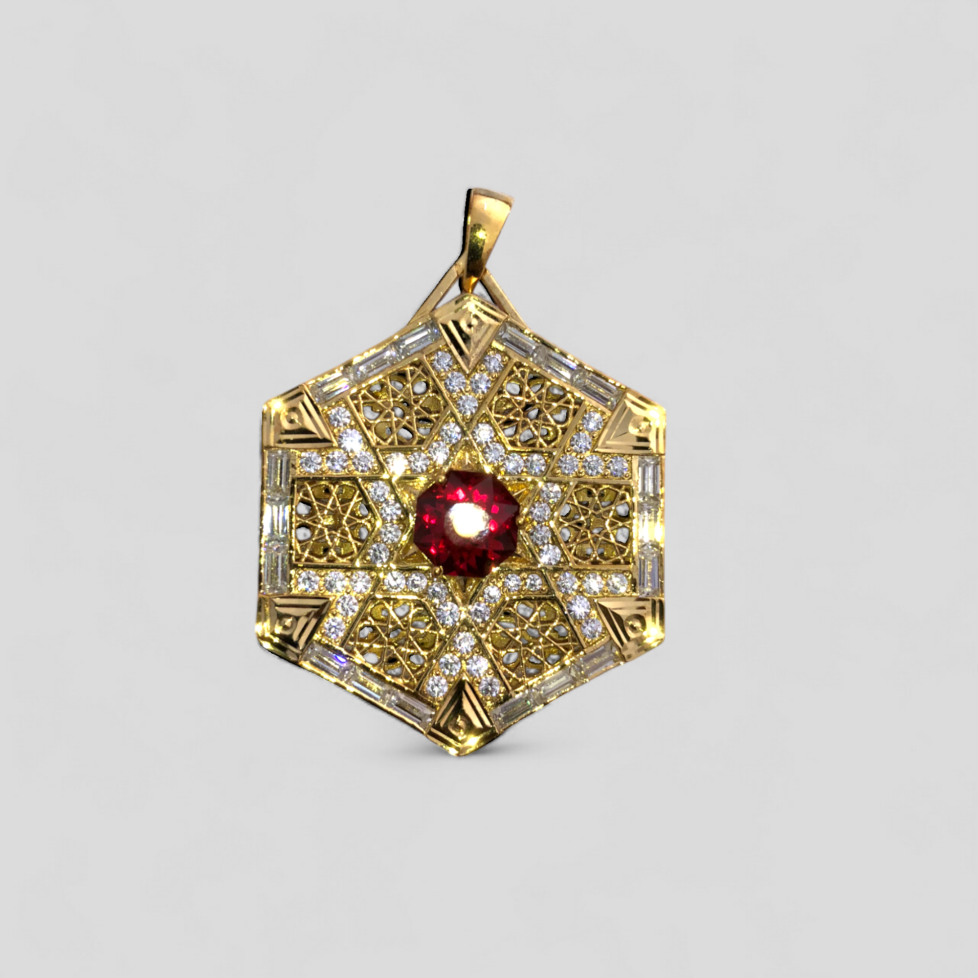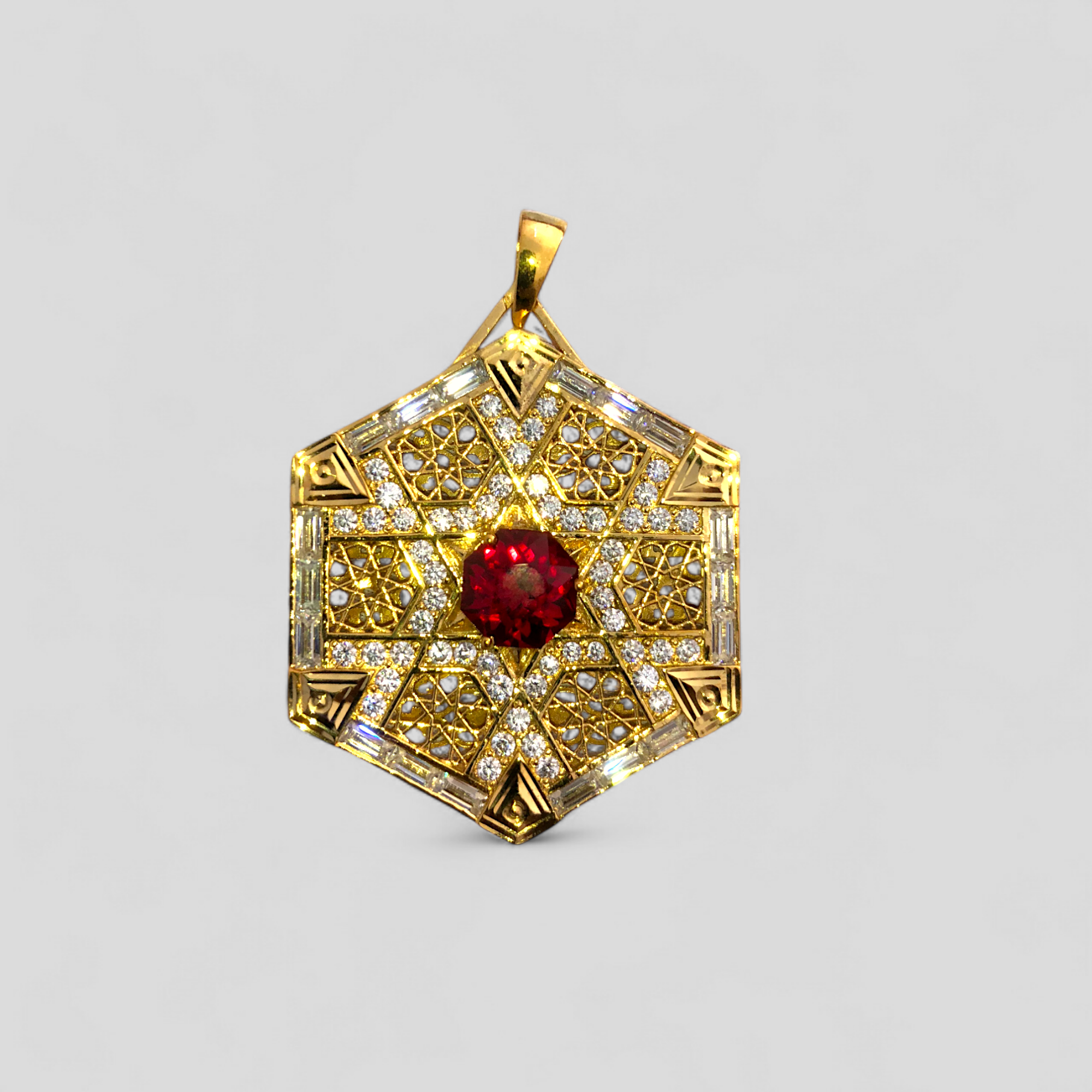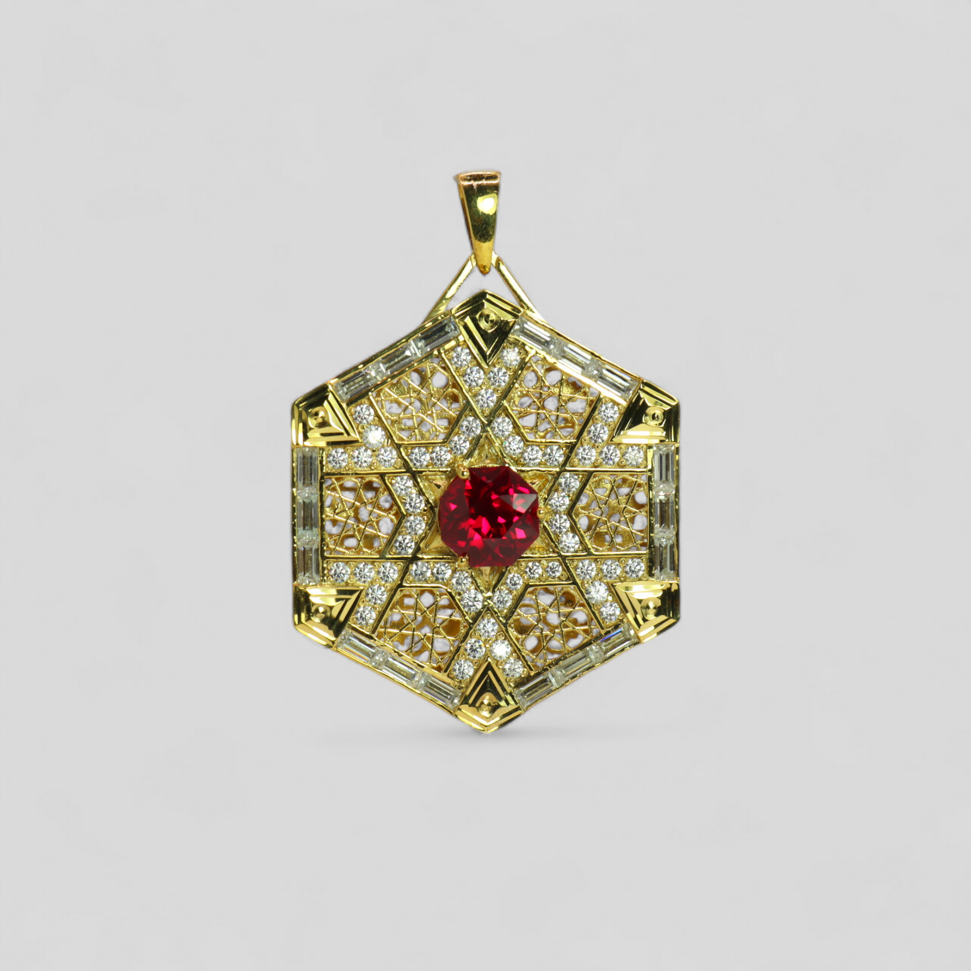 Кулон Jaan Aalam, вдохновлённый сакральным дизайном, воплощает в себе историю, преданность и красоту. Вдохновлённый божественной геометрией исламского искусства, этот кулон украшен сияющими бриллиантами и насыщенным огненным рубином , отражающим многовековое культурное богатство и духовную символику. Этот шедевр элегантности — больше, чем просто украшение, — это отражение наследия, носимого с изяществом.
