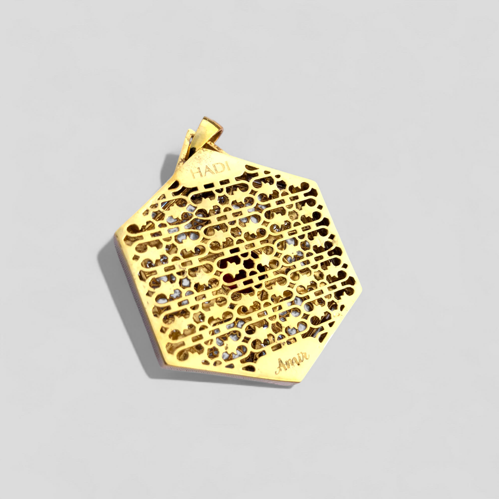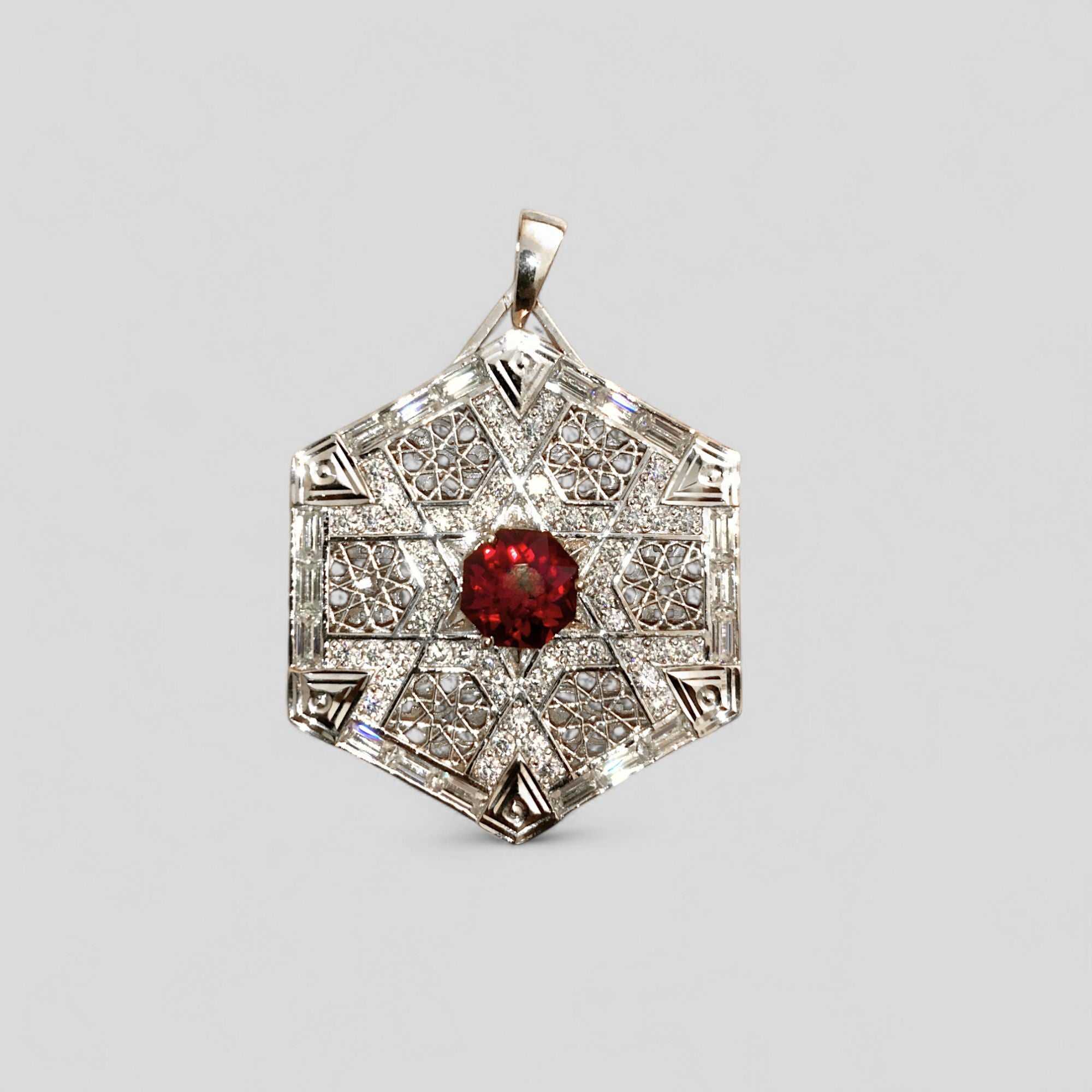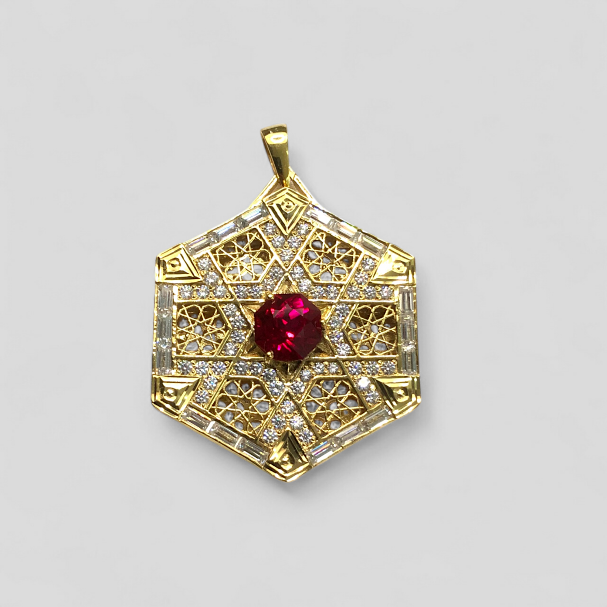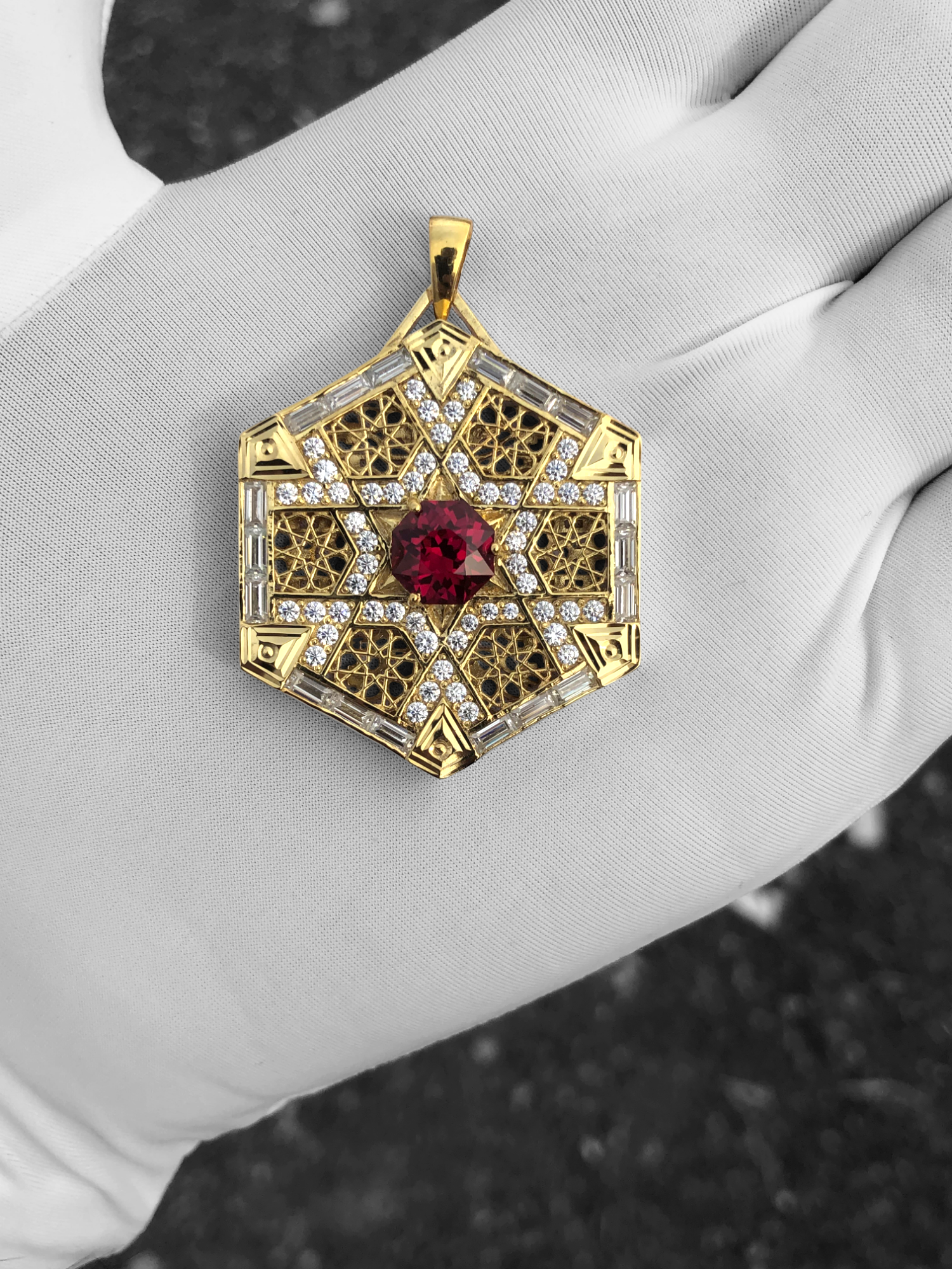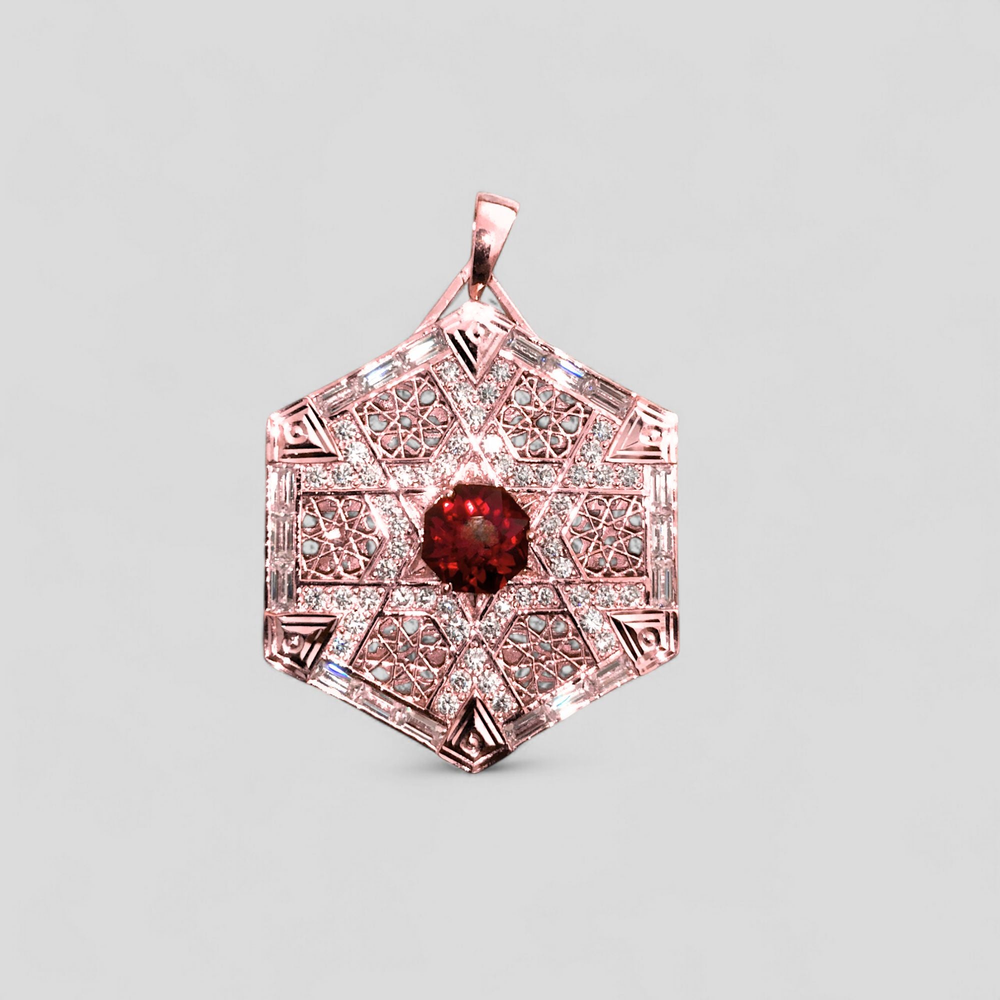 Кулон Jaan Aalam, вдохновлённый сакральным дизайном, воплощает в себе историю, преданность и красоту. Вдохновлённый божественной геометрией исламского искусства, этот кулон украшен сияющими бриллиантами и насыщенным огненным рубином , отражающим многовековое культурное богатство и духовную символику. Этот шедевр элегантности — больше, чем просто украшение, — это отражение наследия, носимого с изяществом.