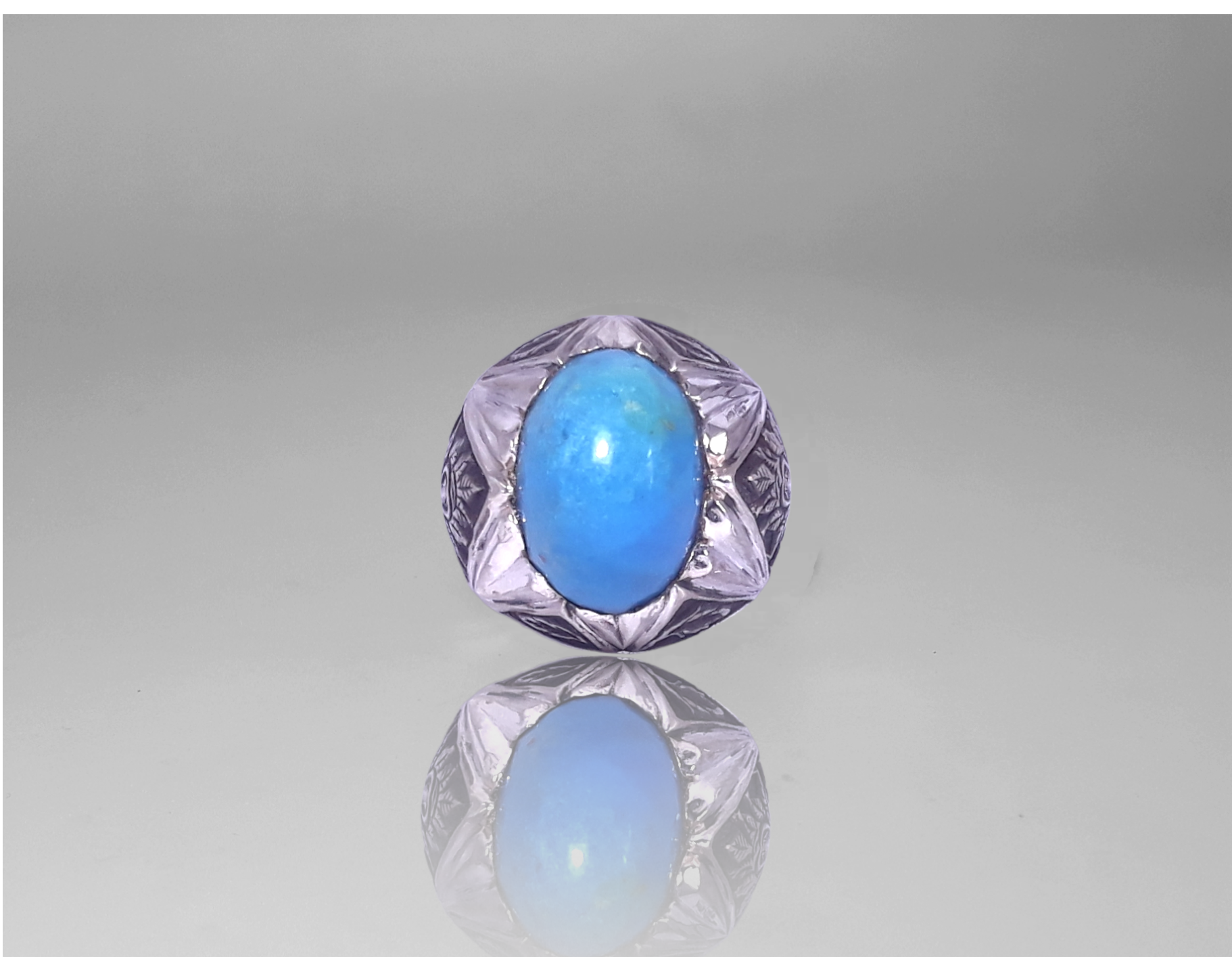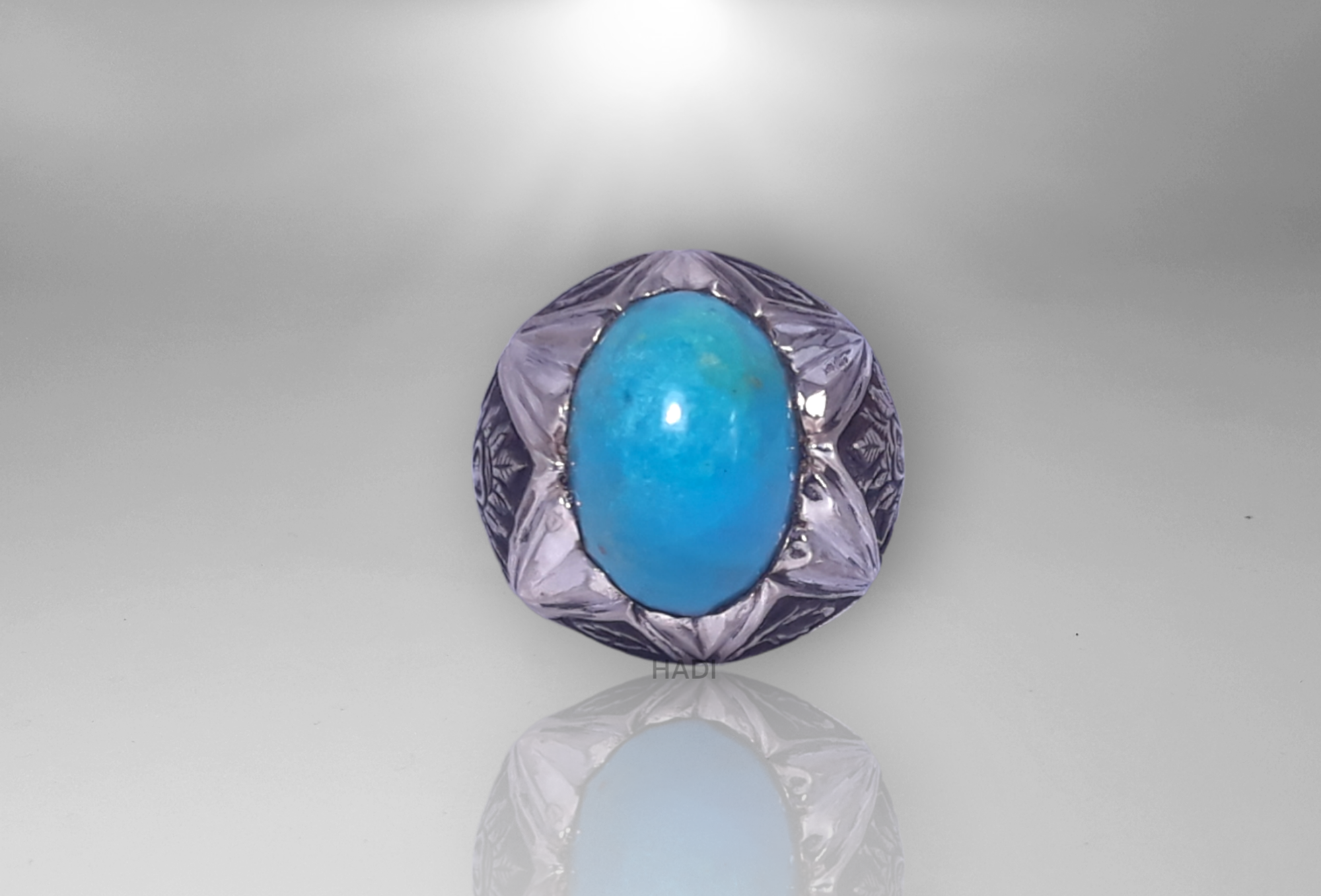Это мужское кольцо-печатка имеет уникальный дизайн с натуральным драгоценным камнем Бирюза, также известным как Feroze, выгравированным на основе стерлингового серебра. Покрытие из 14-каратного белого золота гарантирует, что кольцо будет прочным и долговечным и идеально подойдет особенному мужчине в вашей жизни.