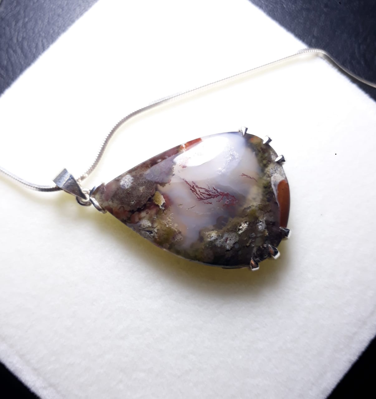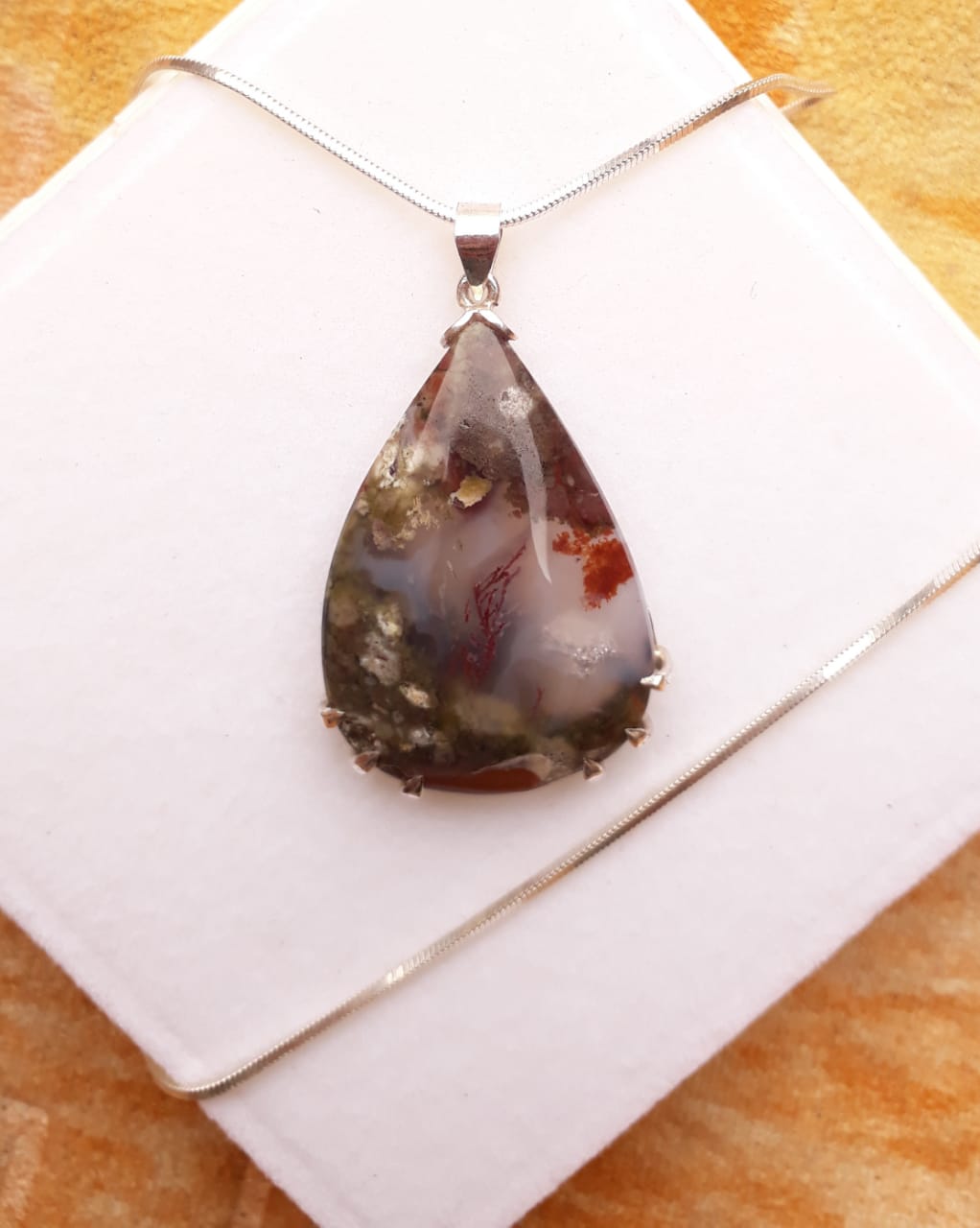 Этот кулон изготовлен из редкого индонезийского шаджри акика (мохового агата) и дополнен красивой итальянской серебряной цепочкой. Считается, что моховой агат приносит смелость, силу и гармонию; Говорят также, что он улучшает умственные функции, помогает принимать мудрые решения и улучшает концентрацию.