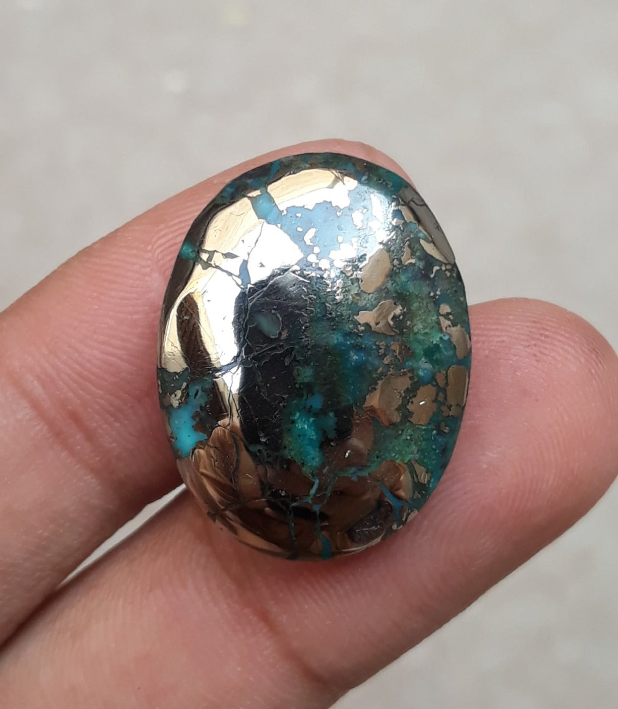 Этот классический кабошон из персидской бирюзы имеет потрясающий глубокий зеленый цвет и сложную матрицу из пирита. Этот камень весом 35,6 карата, профессионально ограненный по форме, станет идеальным выбором для создания красивых украшений или использования в качестве предмета коллекционирования. Благодаря привлекательному дизайну он обязательно добавит красоты любому изделию.