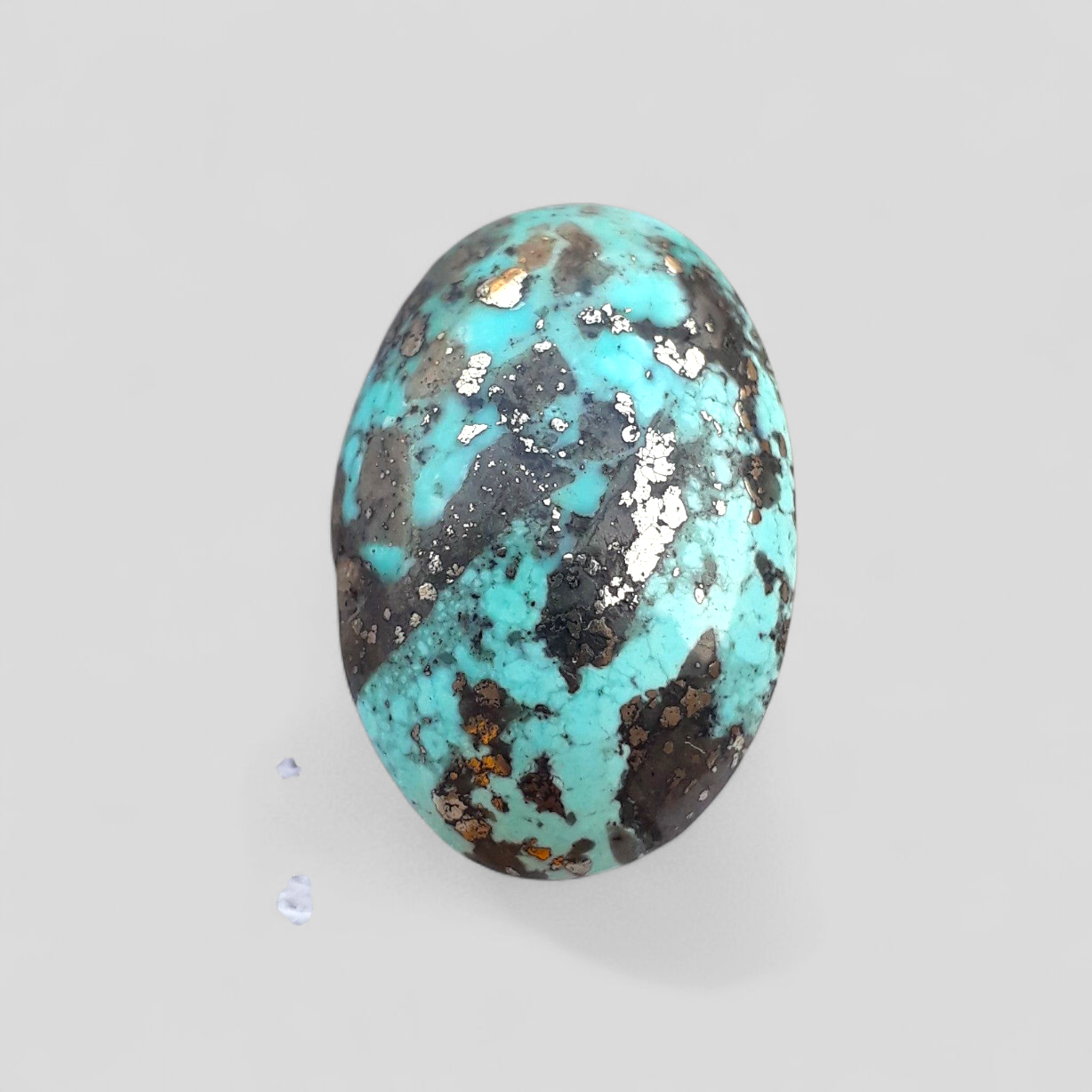 Этот классический кабошон персидской бирюзы отличается потрясающим насыщенным синим цветом и сложной матрицей пирита. Профессионально огранённый, этот камень весом 22,50 карата идеально подходит для создания прекрасных ювелирных изделий или коллекционирования. Благодаря своему эффектному дизайну он, несомненно, украсит любое украшение.