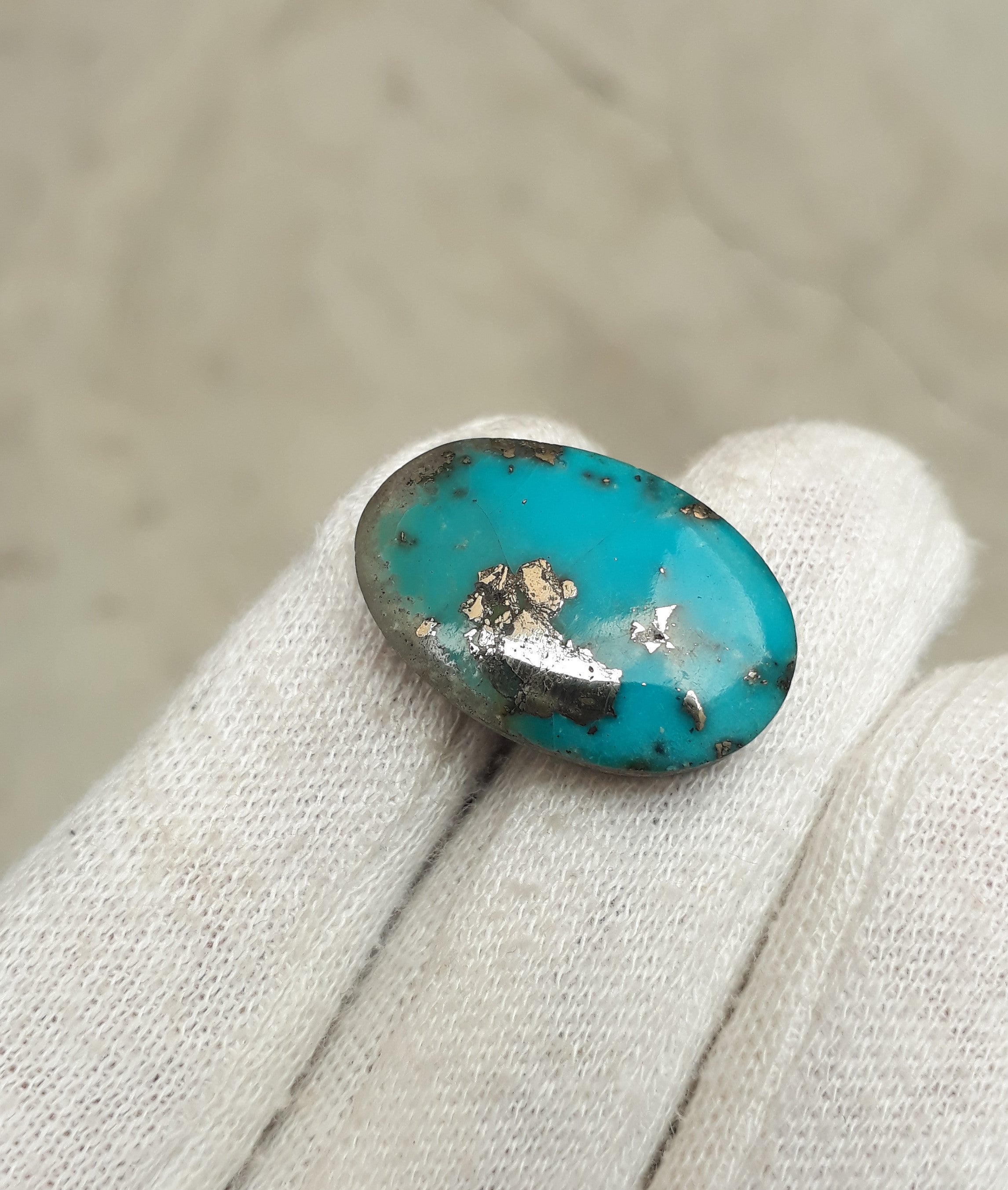 Этот классический кабошон персидской бирюзы отличается потрясающим насыщенным синим цветом и сложной матрицей пирита. Профессионально огранённый, этот 23-каратный камень идеально подходит для создания прекрасных ювелирных изделий или коллекционирования. Благодаря своему эффектному дизайну он, несомненно, украсит любое украшение.