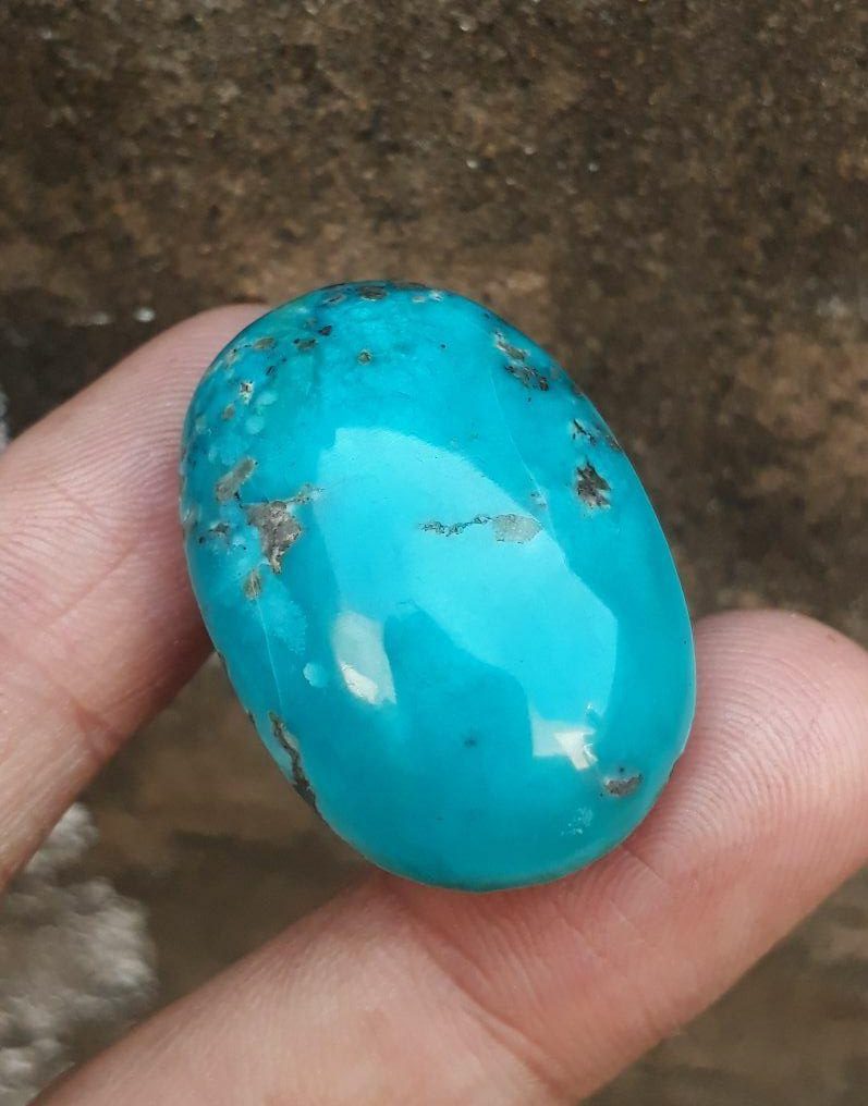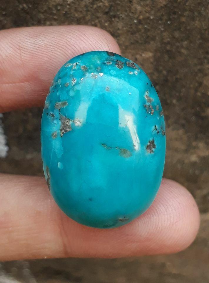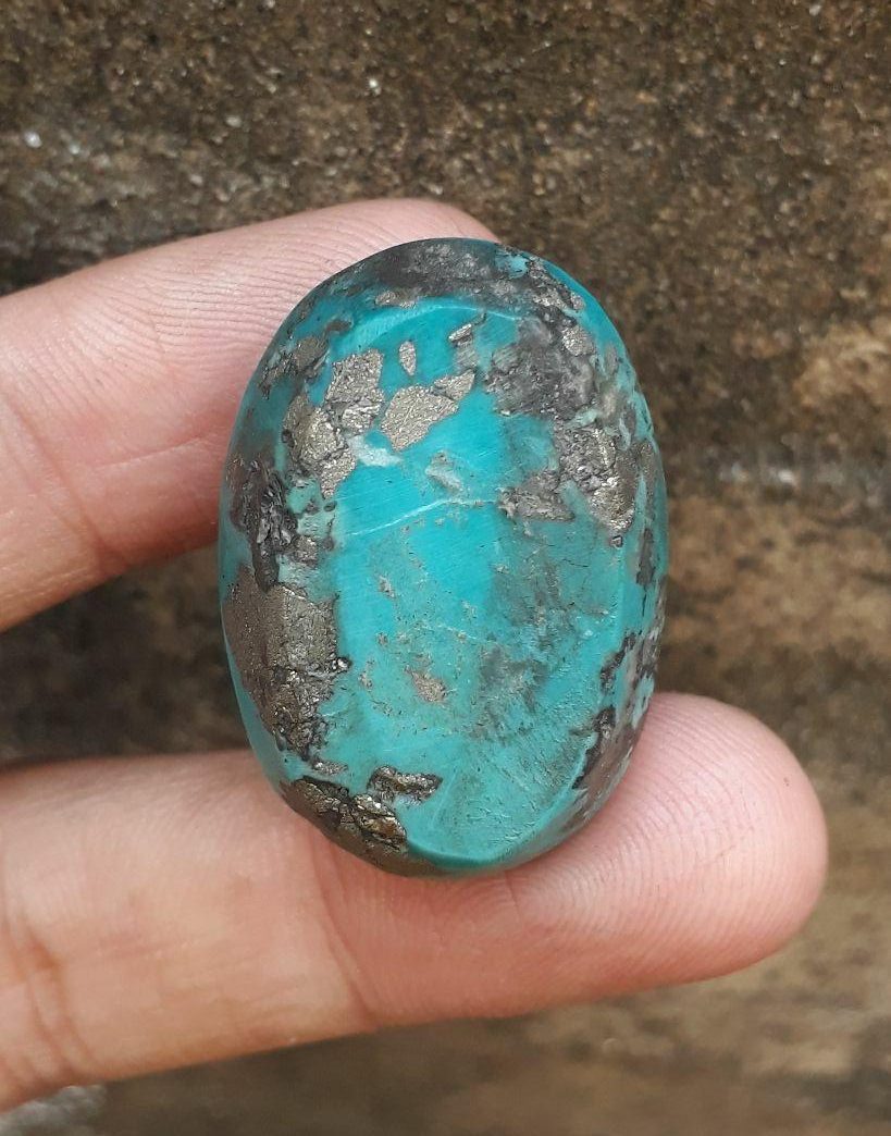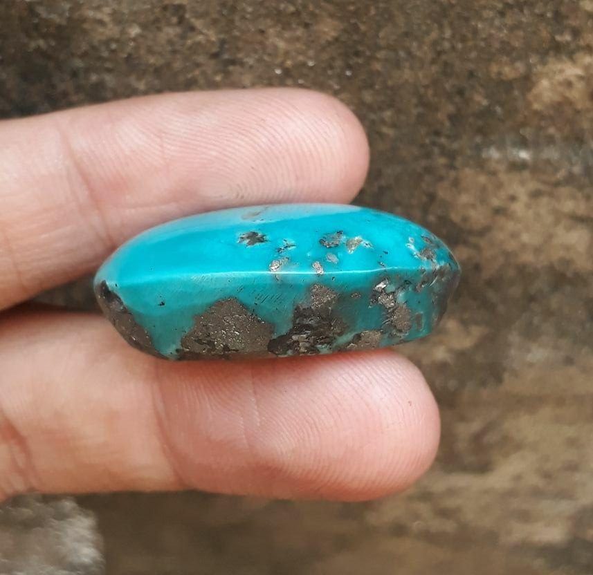 Эта натуральная бирюза с пиритом является изысканным образцом гранильного искусства. Эта голубая матричная бирюза искусно обработана, чтобы подчеркнуть ее красивый естественный оттенок, имеет блестящую овальную форму размером 33x23 мм и вес 72 карата. Идеально подходит для любой коллекции.