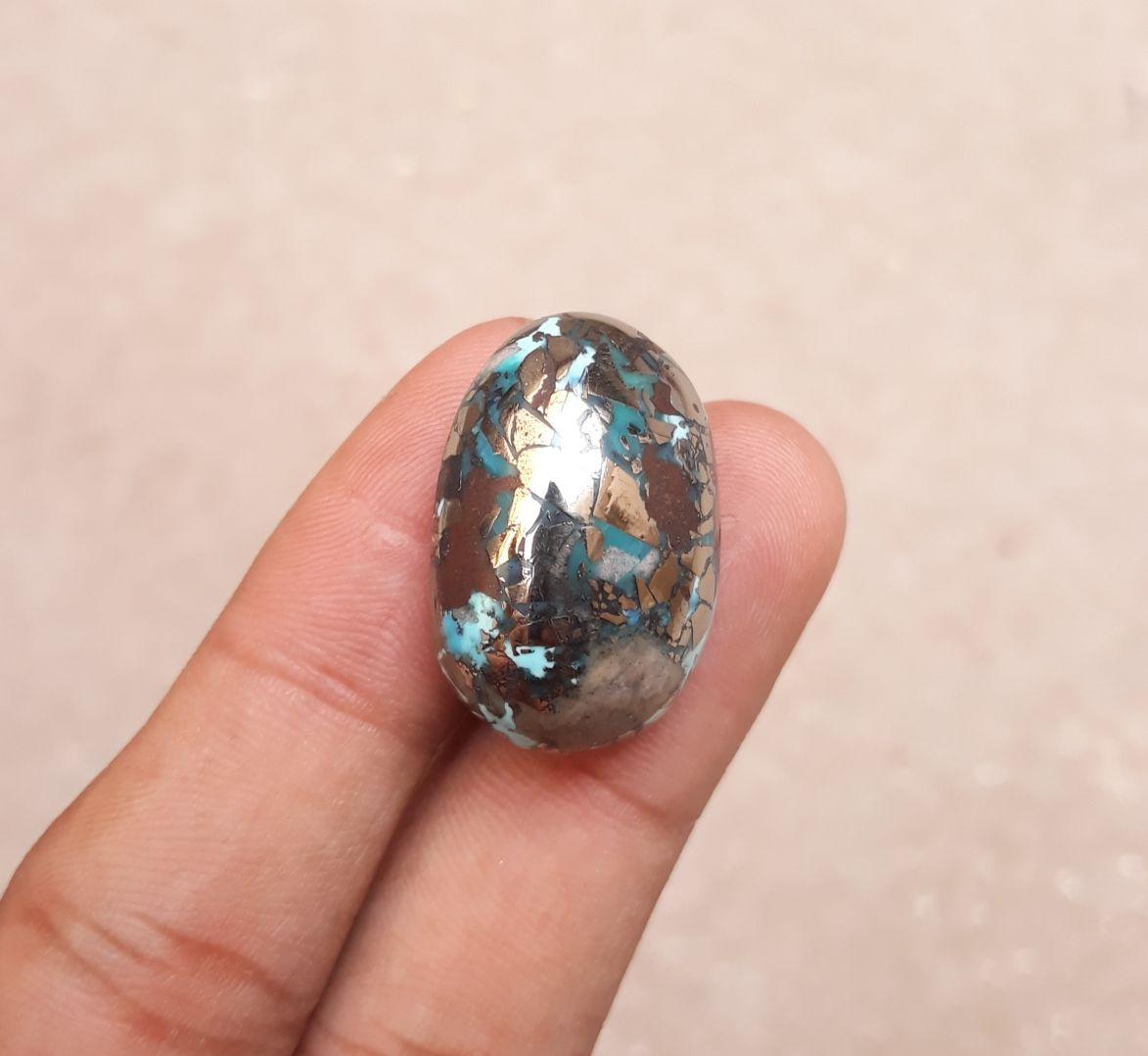 Эта великолепная натуральная голубая бирюза тщательно огранена и отполирована, чтобы подчеркнуть ее поразительные черты. Камень весом 62,3 карата дополнен красивым золотистым пиритом и имеет овальную огранку размером 27x18 мм. Он идеально подходит для использования в ювелирном деле или в качестве предмета коллекционирования.
