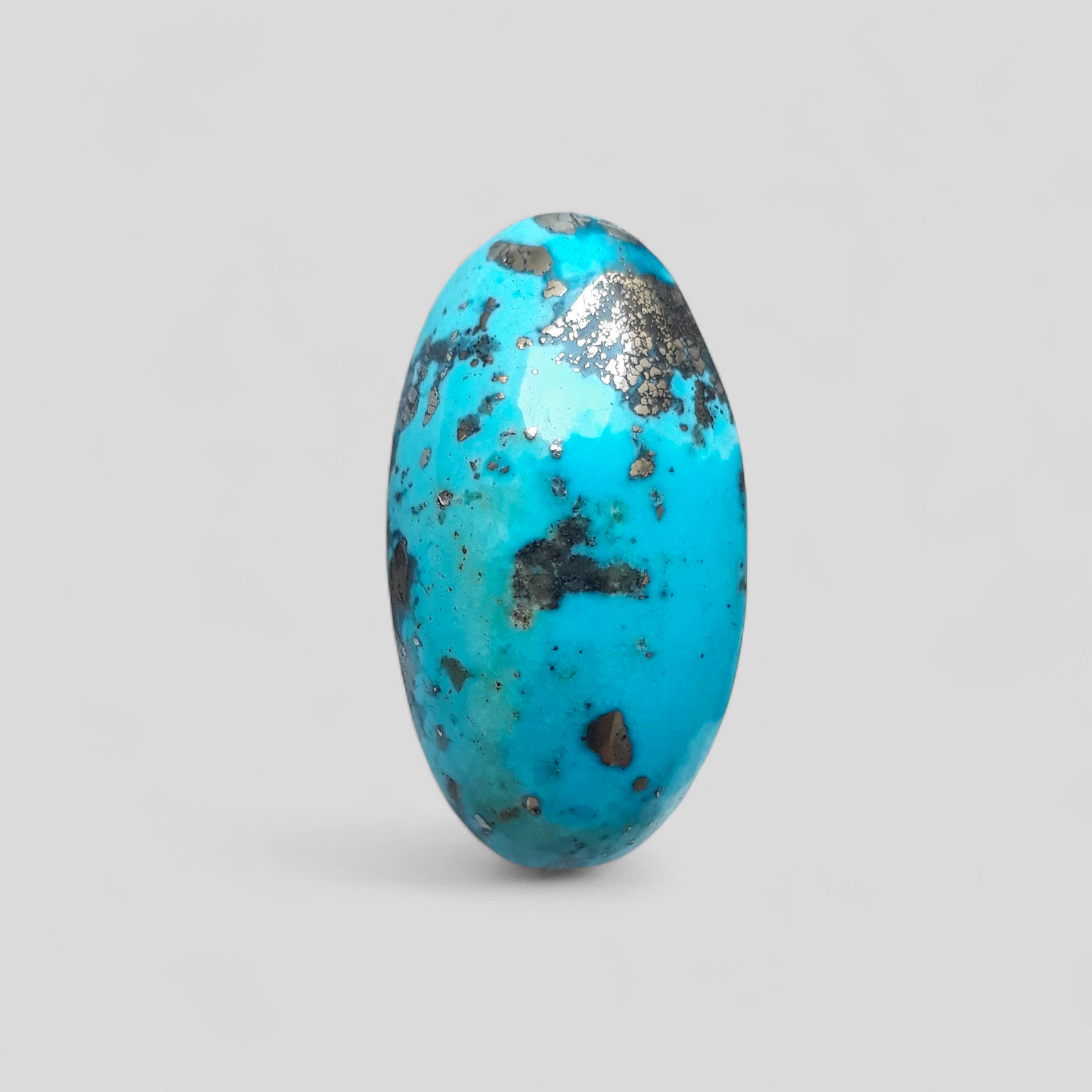 Этот классический кабошон персидской бирюзы отличается потрясающим насыщенным синим цветом и сложной матрицей пирита. Профессионально огранённый, этот 34-каратный камень идеально подходит для создания прекрасных ювелирных изделий или коллекционирования. Благодаря своему эффектному дизайну он, несомненно, украсит любое украшение.
