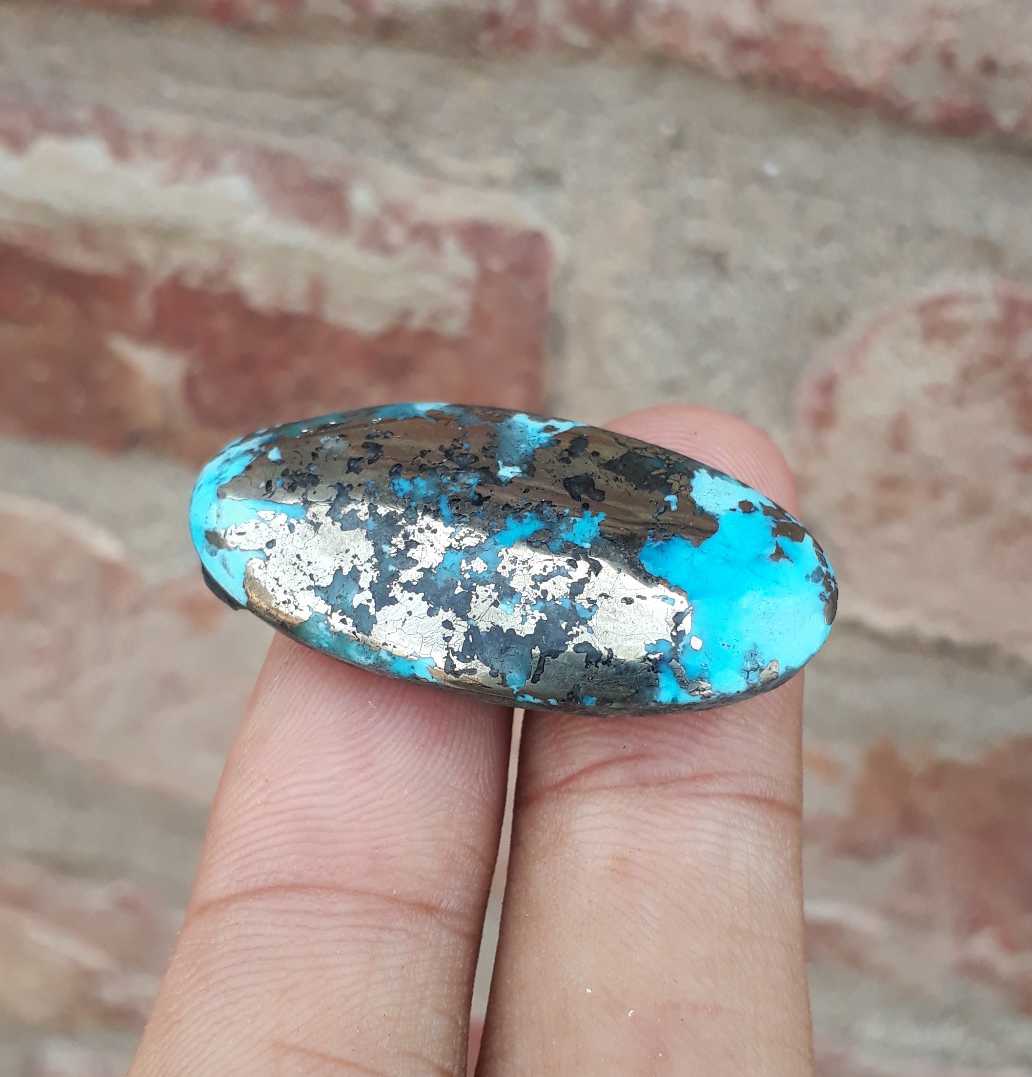 Этот классический кабошон персидской бирюзы отличается потрясающим насыщенным синим цветом и сложной матрицей пирита. Профессионально огранённый, этот 41-каратный камень идеально подходит для создания прекрасных ювелирных изделий или коллекционирования. Благодаря своему эффектному дизайну он, несомненно, украсит любое украшение.