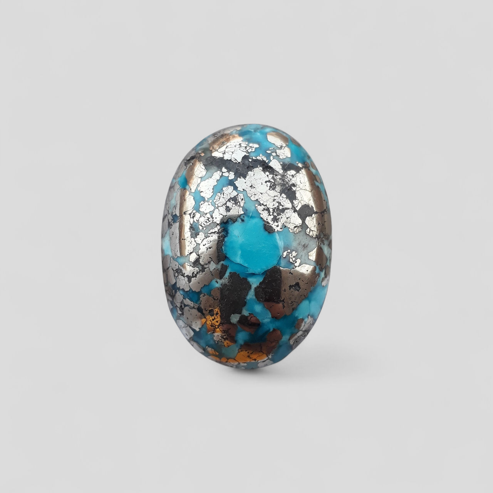 Этот классический кабошон персидской бирюзы отличается потрясающим насыщенным синим цветом и сложной матрицей пирита. Профессионально огранённый, этот 43-каратный камень идеально подходит для создания прекрасных ювелирных изделий или коллекционирования. Благодаря своему эффектному дизайну он, несомненно, украсит любое украшение.