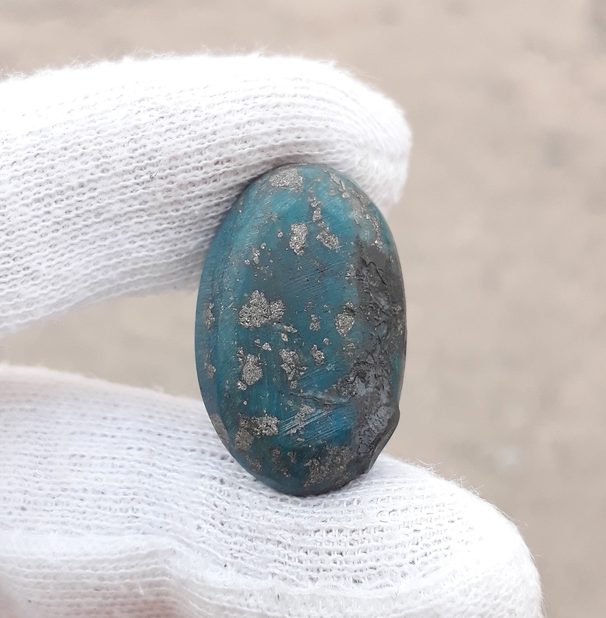 Этот классический кабошон персидской бирюзы отличается потрясающим насыщенным синим цветом и сложной матрицей пирита. Профессионально огранённый, этот 47-каратный камень идеально подходит для создания прекрасных ювелирных изделий или коллекционирования. Благодаря своему эффектному дизайну он, несомненно, украсит любое украшение.