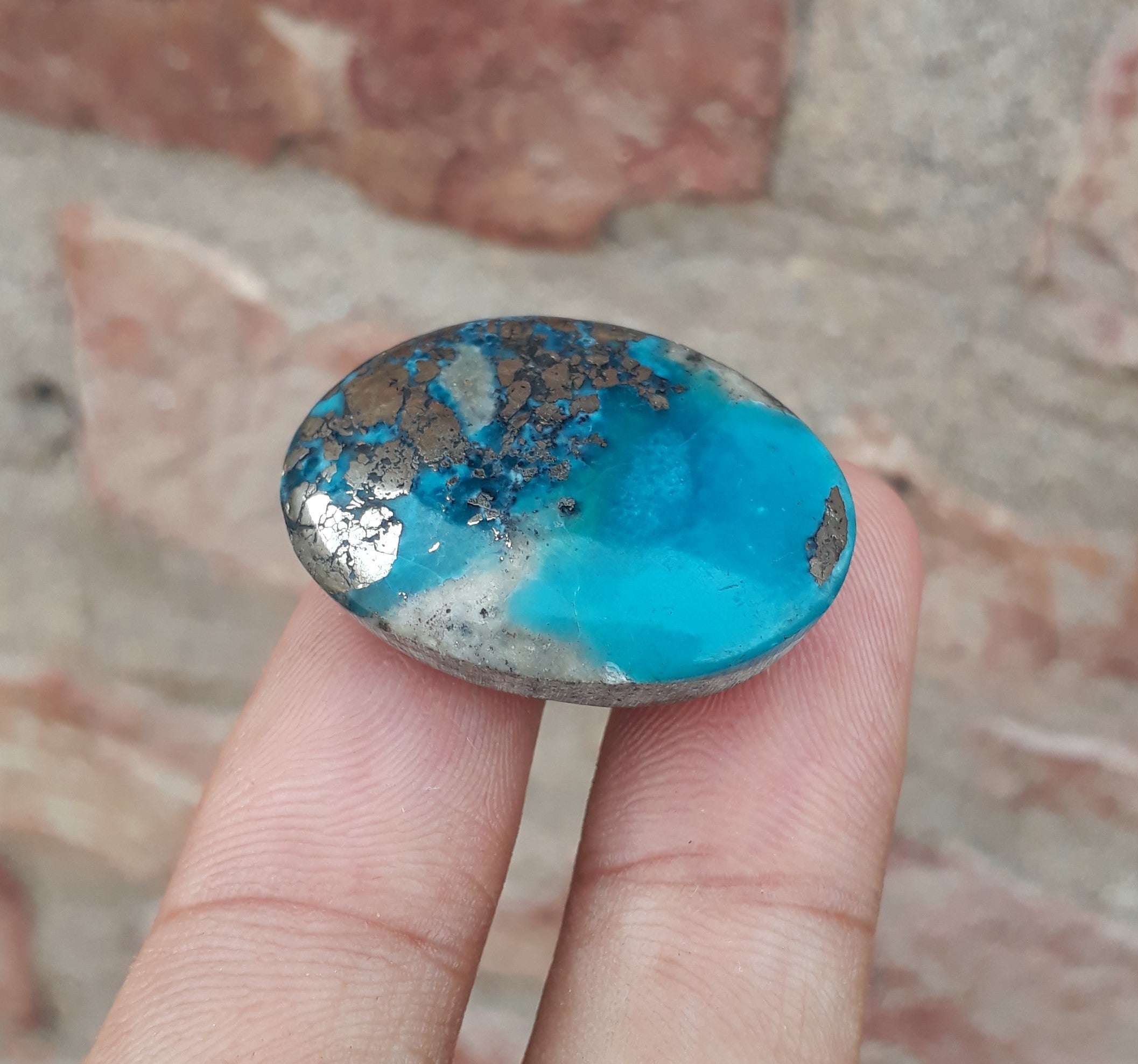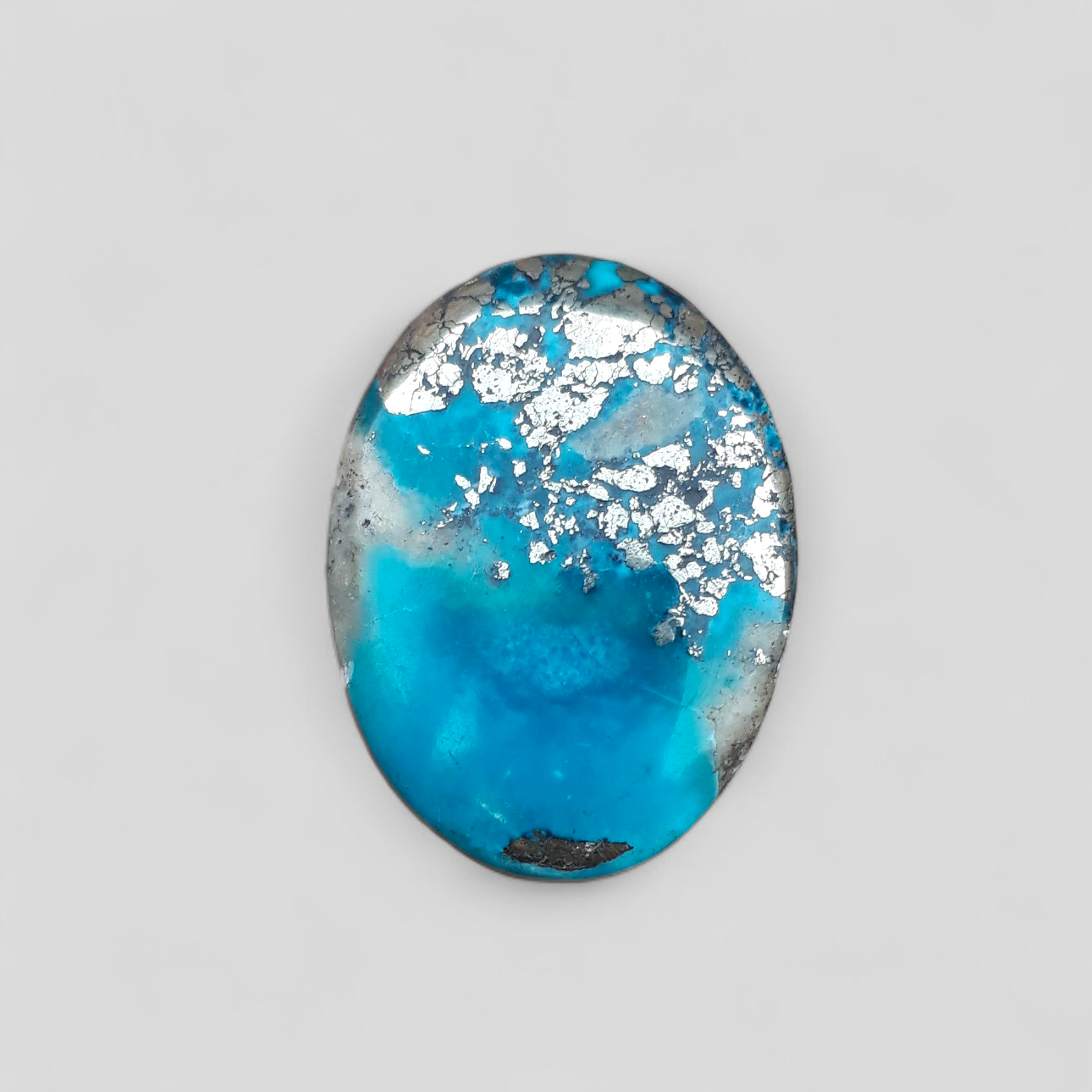 Этот классический кабошон персидской бирюзы отличается потрясающим насыщенным синим цветом и сложной матрицей пирита. Профессионально огранённый, этот 50-каратный камень идеально подходит для создания прекрасных ювелирных изделий или коллекционирования. Благодаря своему эффектному дизайну он, несомненно, украсит любое украшение.