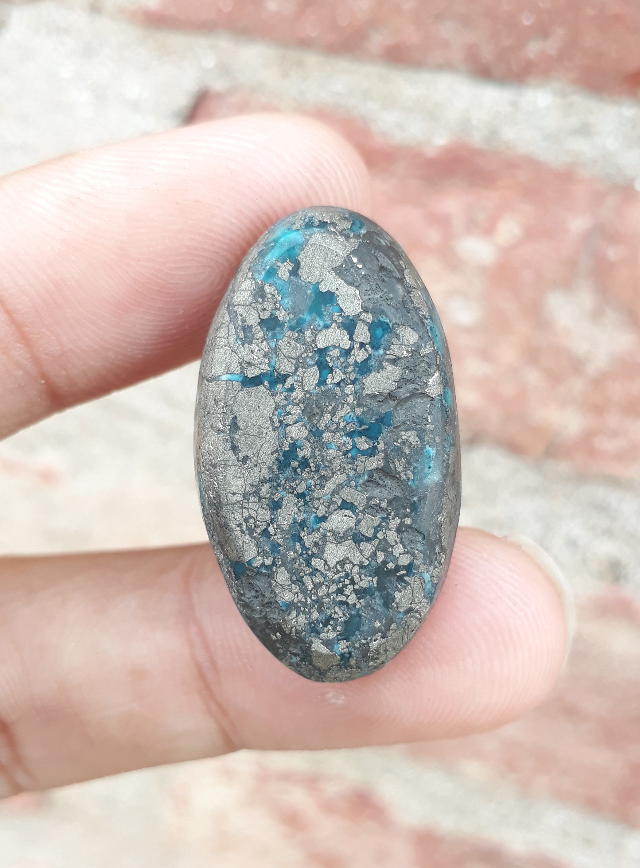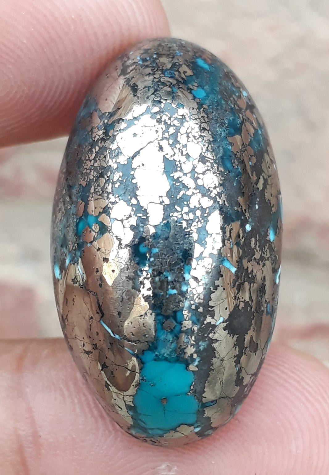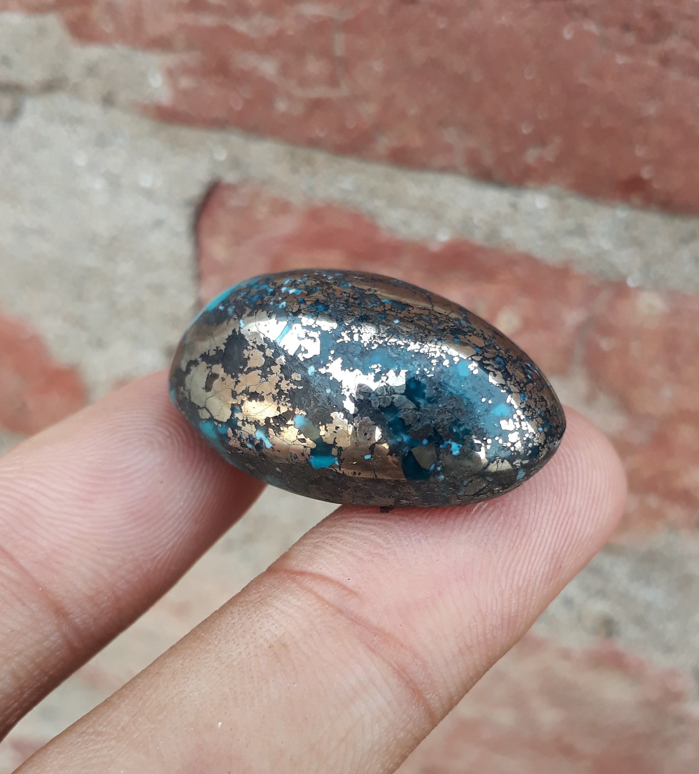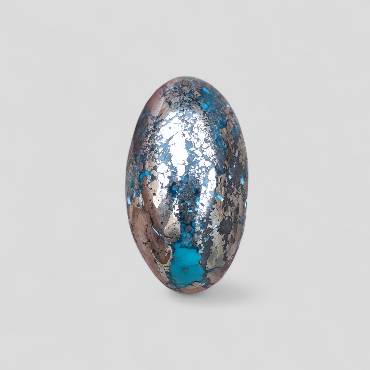 Этот классический кабошон персидской бирюзы отличается потрясающим насыщенным синим цветом и сложной матрицей пирита. Профессионально огранённый, этот 75-каратный камень идеально подходит для создания прекрасных ювелирных изделий или коллекционирования. Благодаря своему эффектному дизайну он, несомненно, украсит любое украшение.