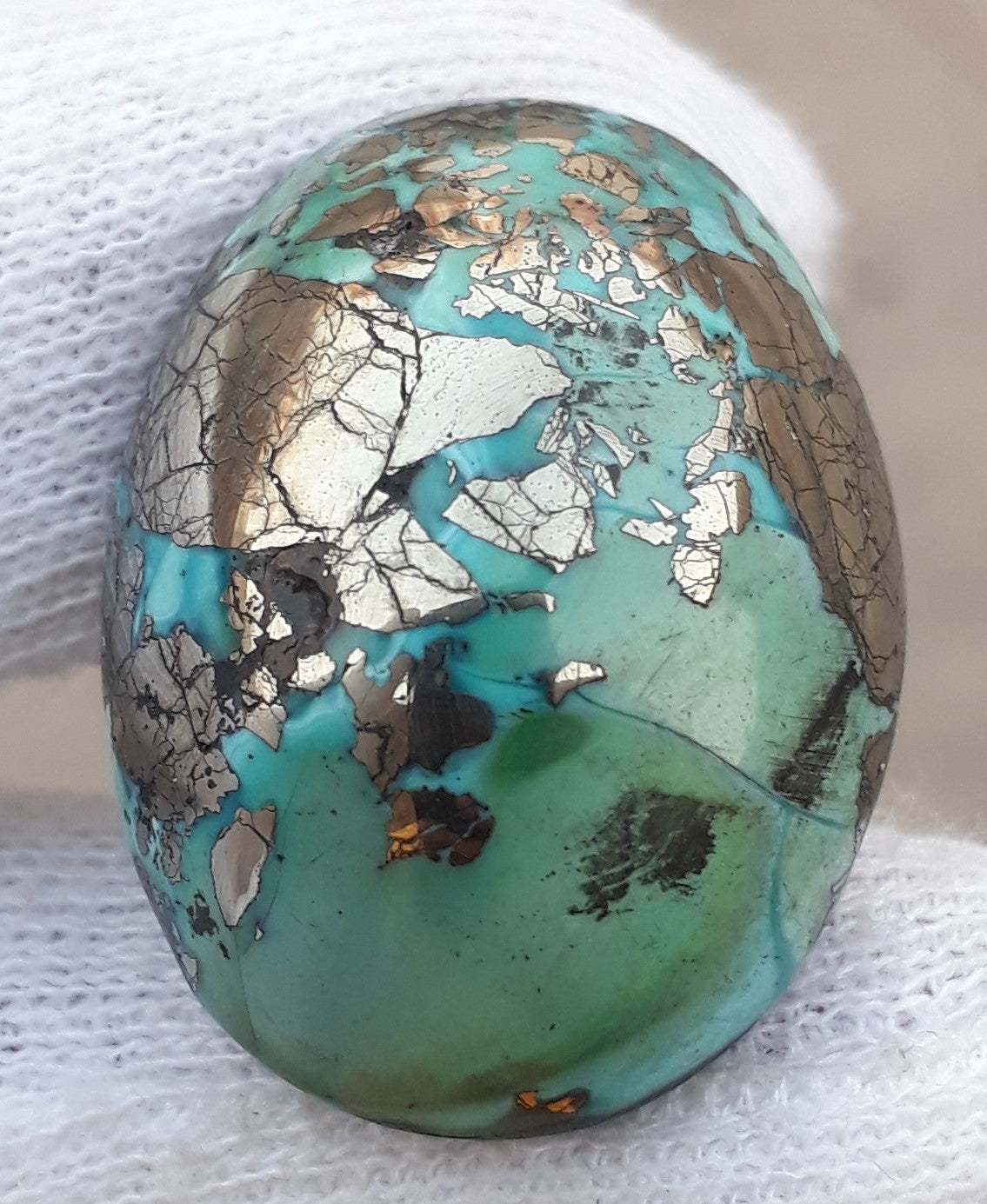 Этот классический кабошон персидской бирюзы отличается потрясающим насыщенным синим цветом и сложной матрицей пирита. Профессионально ограненный, этот 78-каратный камень идеально подходит для создания прекрасных ювелирных изделий или коллекционирования. Благодаря своему эффектному дизайну он, несомненно, украсит любое украшение.