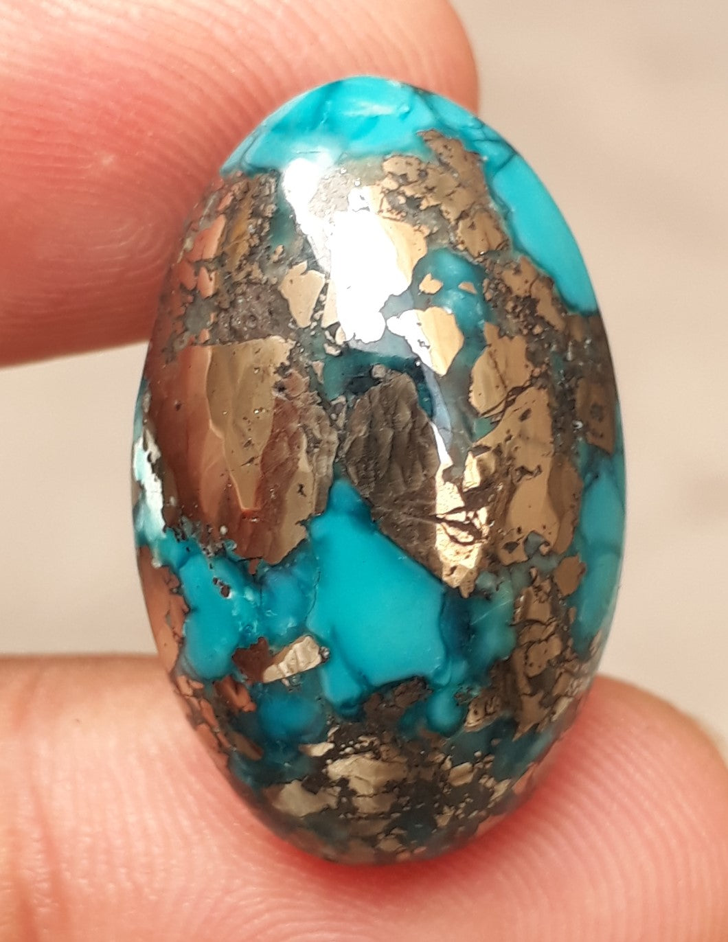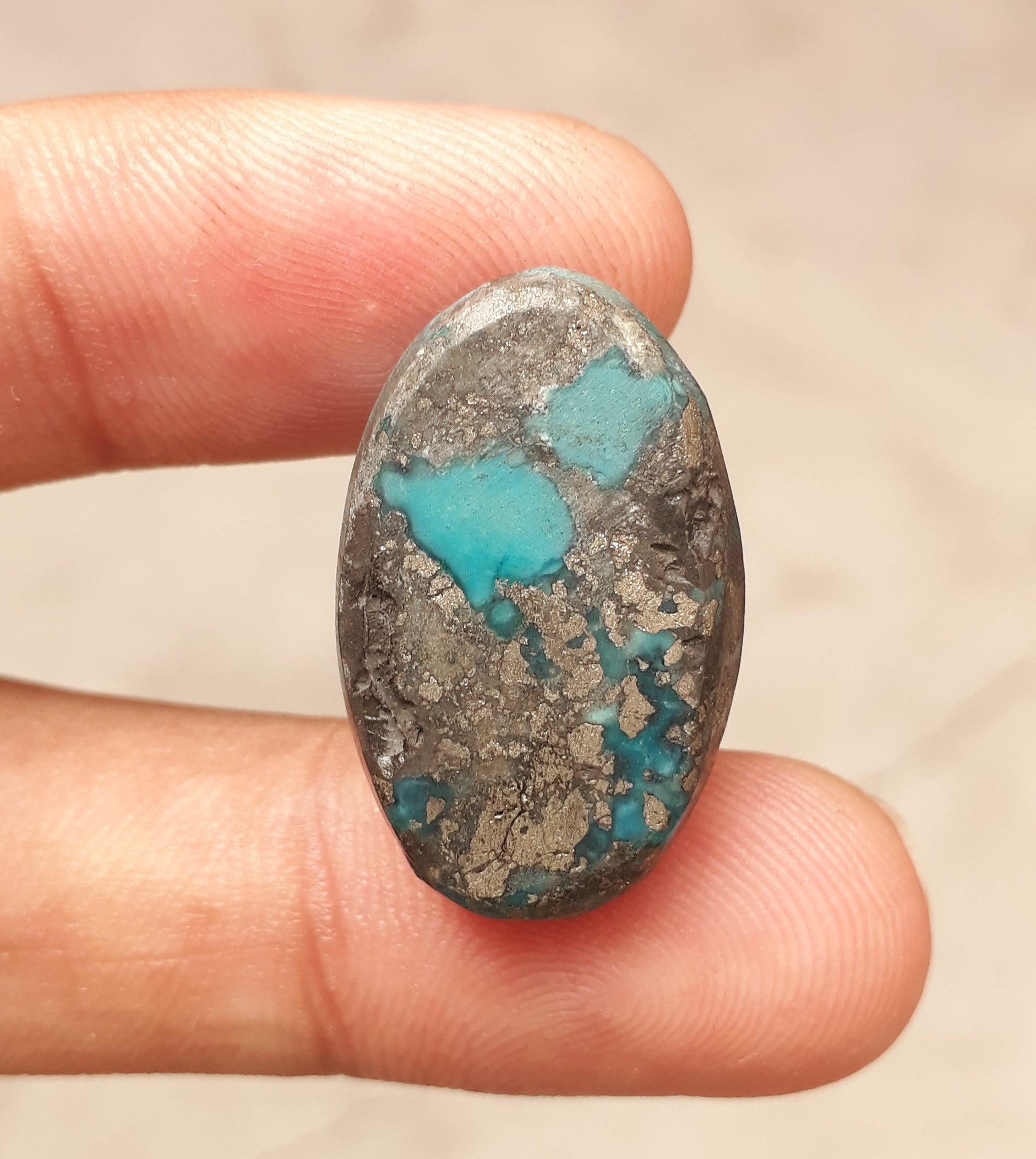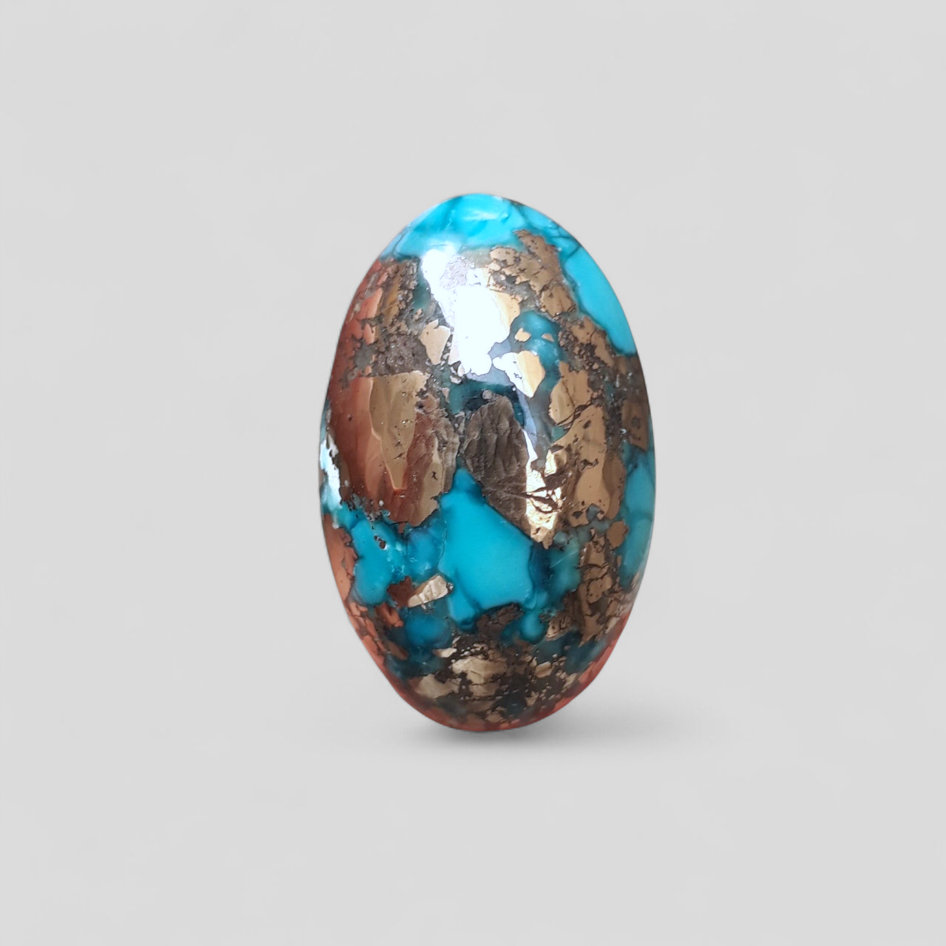 Этот классический кабошон персидской бирюзы отличается потрясающим насыщенным синим цветом и сложной матрицей пирита. Профессионально огранённый, этот камень весом 43,50 карата идеально подходит для создания прекрасных ювелирных изделий или коллекционирования. Благодаря своему эффектному дизайну он, несомненно, украсит любое украшение.