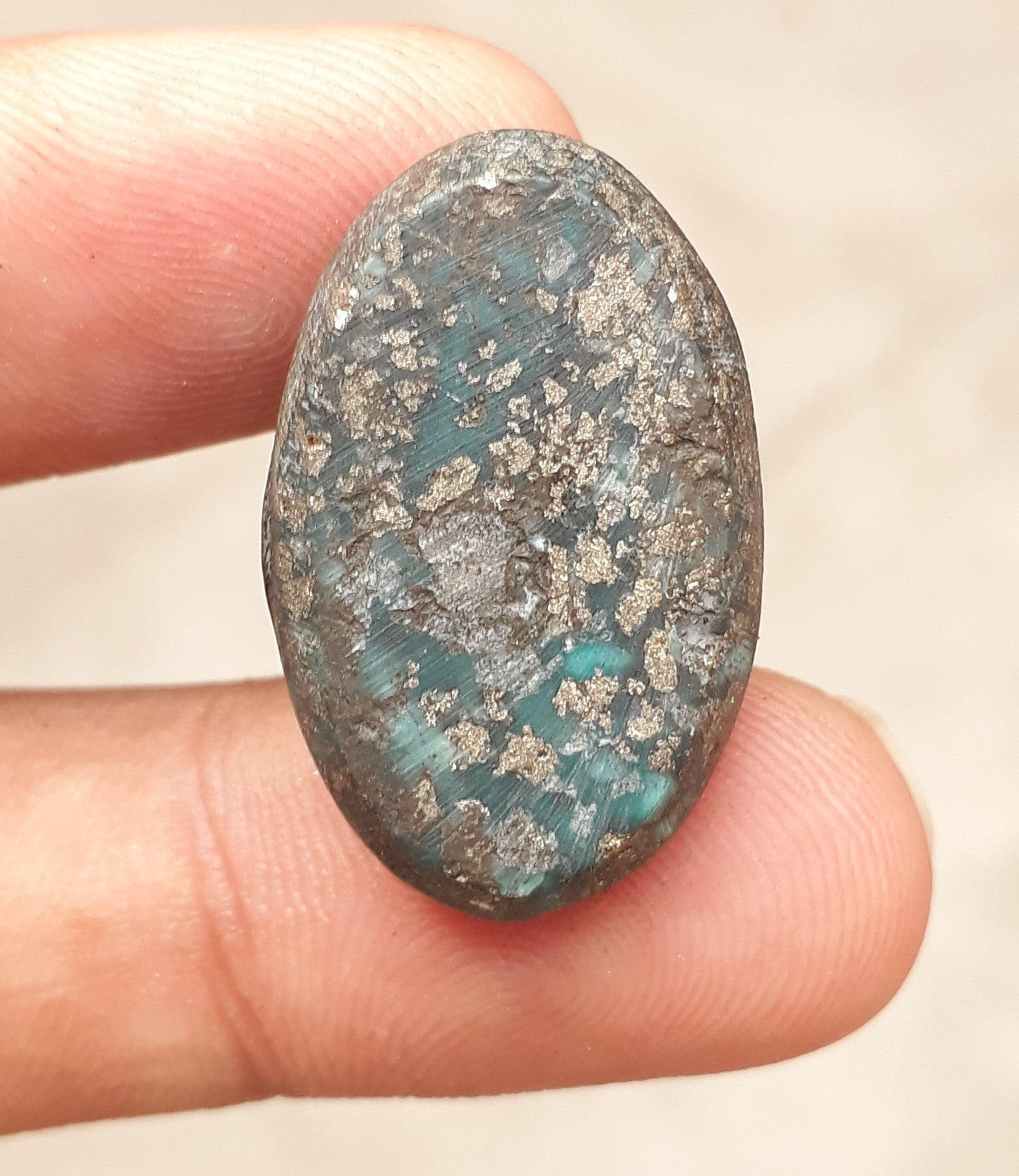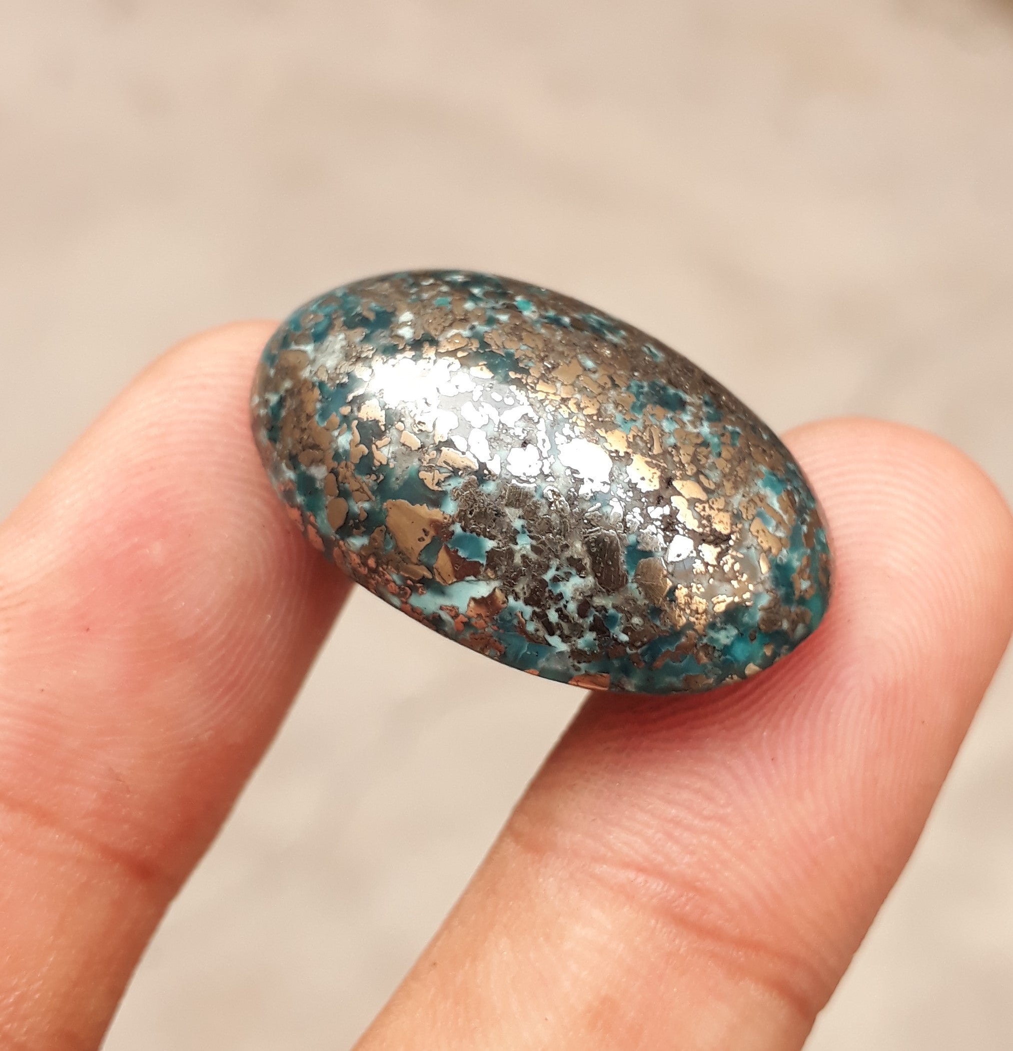 Этот классический кабошон персидской бирюзы отличается потрясающим насыщенным синим цветом и сложной матрицей пирита. Этот камень весом 45,80 карата, профессионально ограненный, идеально подходит для создания прекрасных ювелирных изделий или коллекционирования. Благодаря своему эффектному дизайну он, несомненно, украсит любое украшение.