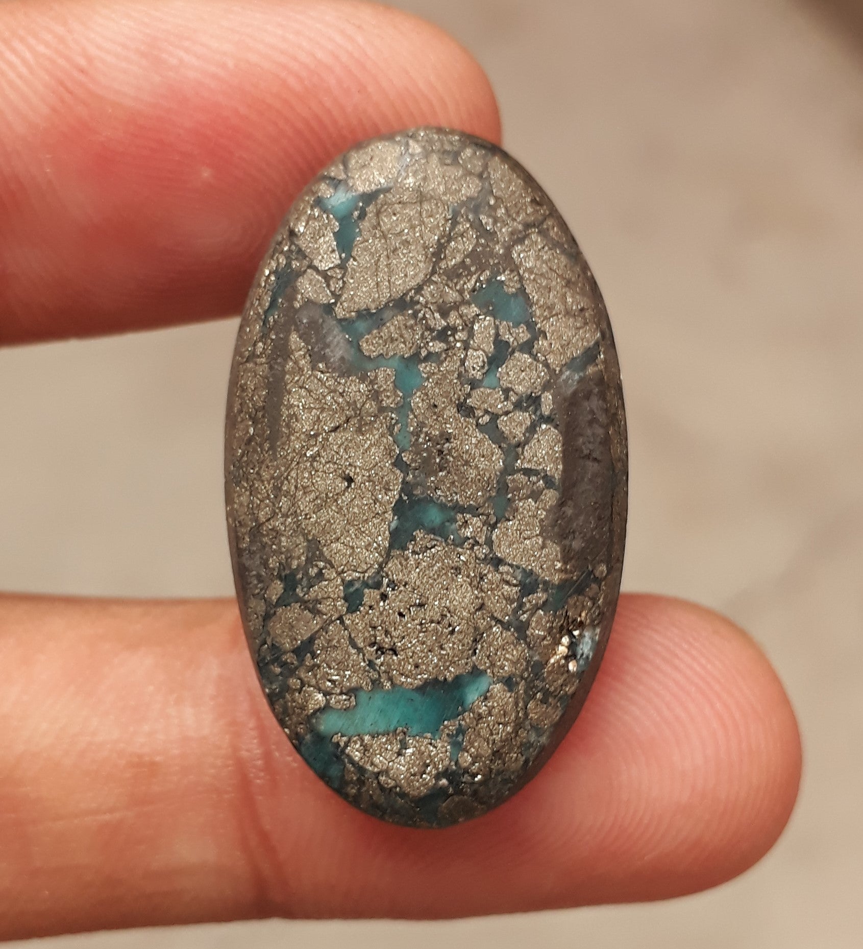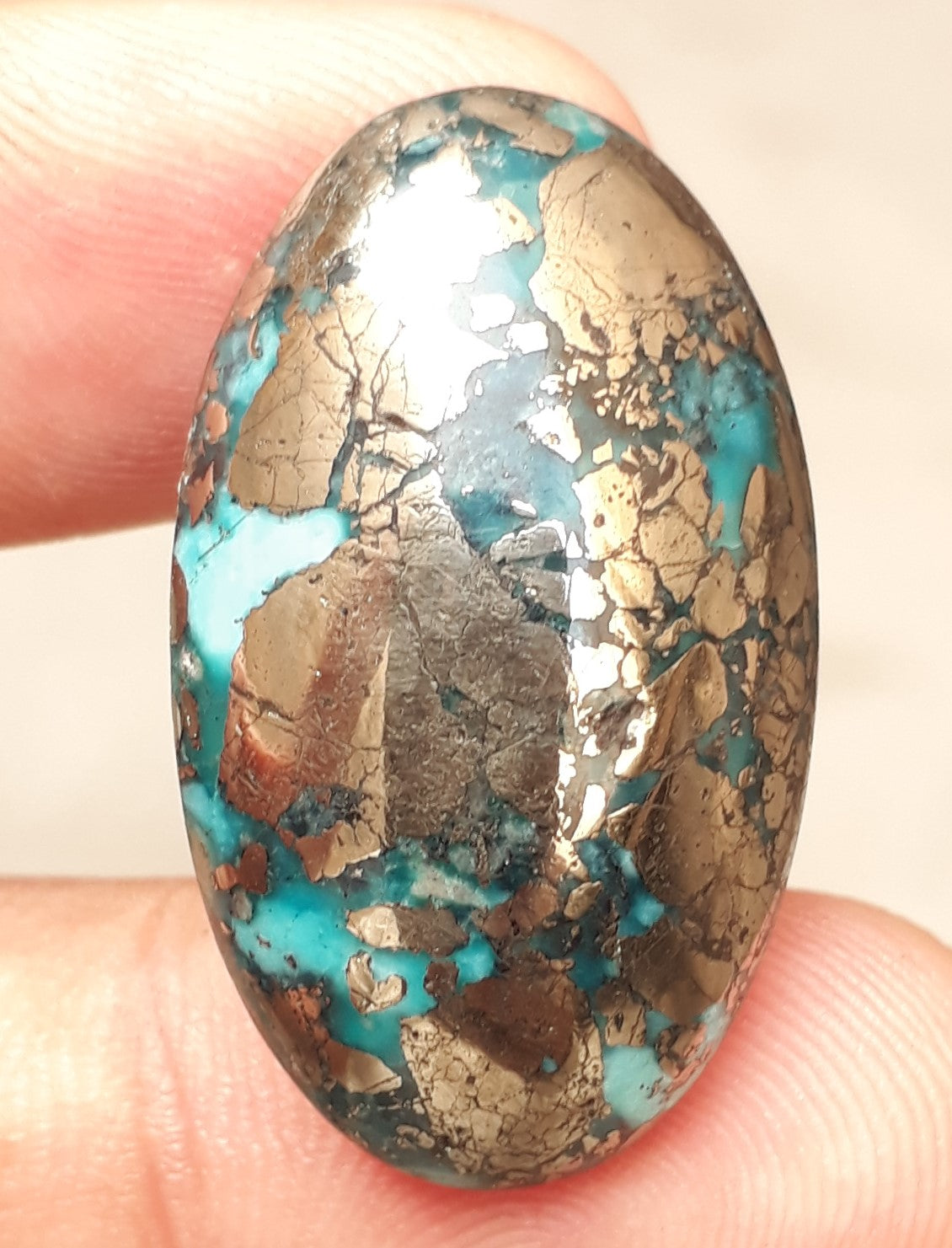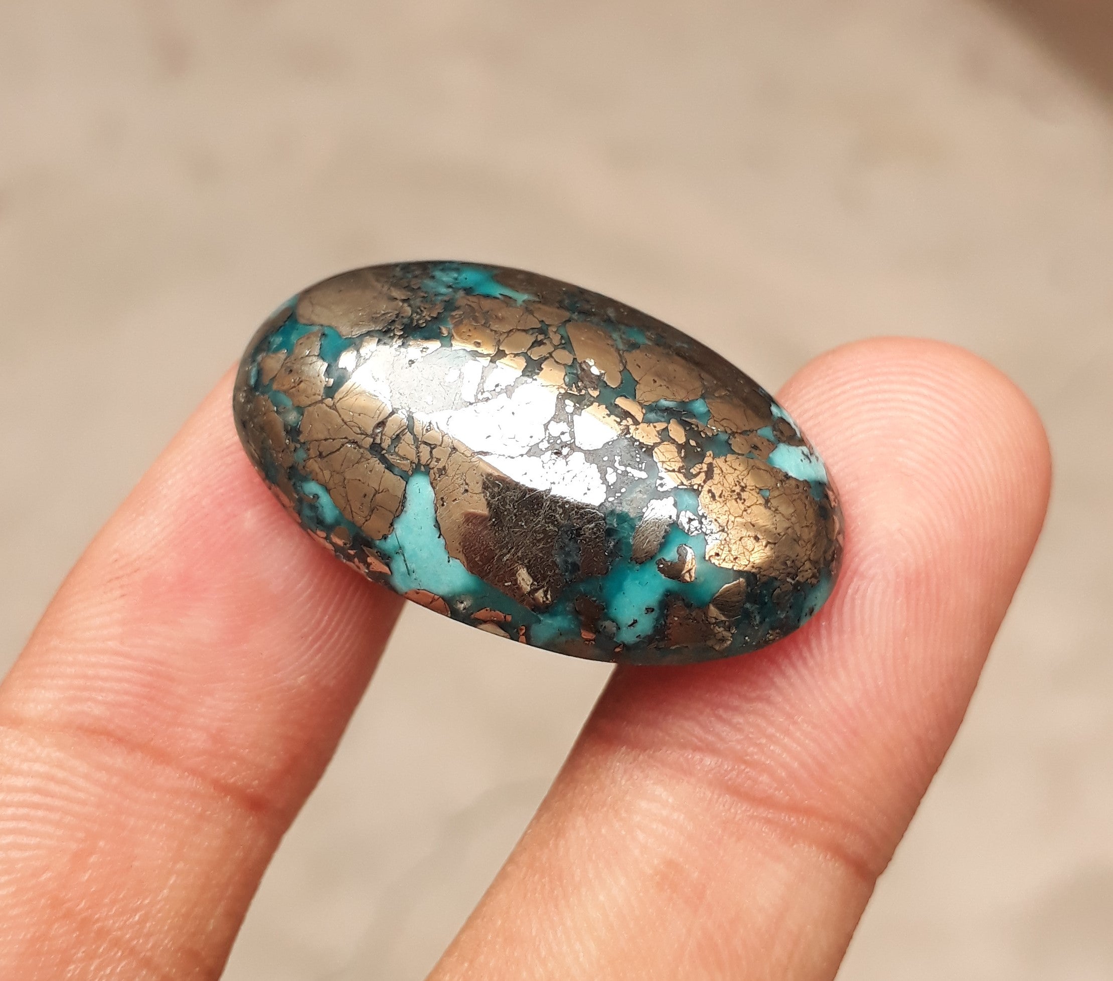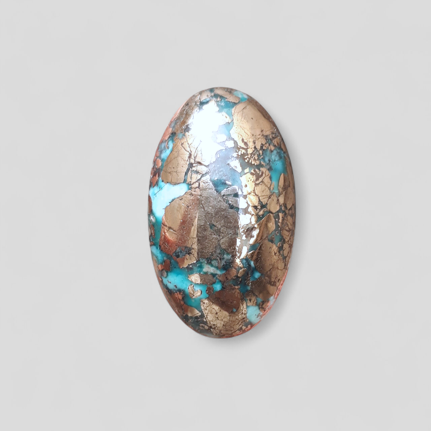 Этот классический кабошон персидской бирюзы отличается потрясающим насыщенным синим цветом и сложной матрицей пирита. Профессионально огранённый, этот камень весом 58,80 карата идеально подходит для создания прекрасных ювелирных изделий или коллекционирования. Благодаря своему эффектному дизайну он, несомненно, украсит любое украшение.